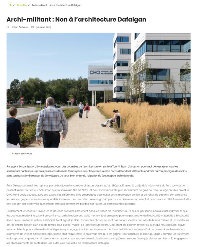 Lettre ouverte publiée au sujet du modèle actuel de l’architecture de la clinique CHC MontLégia. L’auteur souligne l’importance d’une architecture plus centrée sur les personnes et les communautés qu’elle sert. C’est ainsi que nous caractérisons l’architecture inclusive. Parce qu’elle compose des villes, abrite des vies, héberge des fonctions et traduit des cultures, elle relève d’une approche sensible.