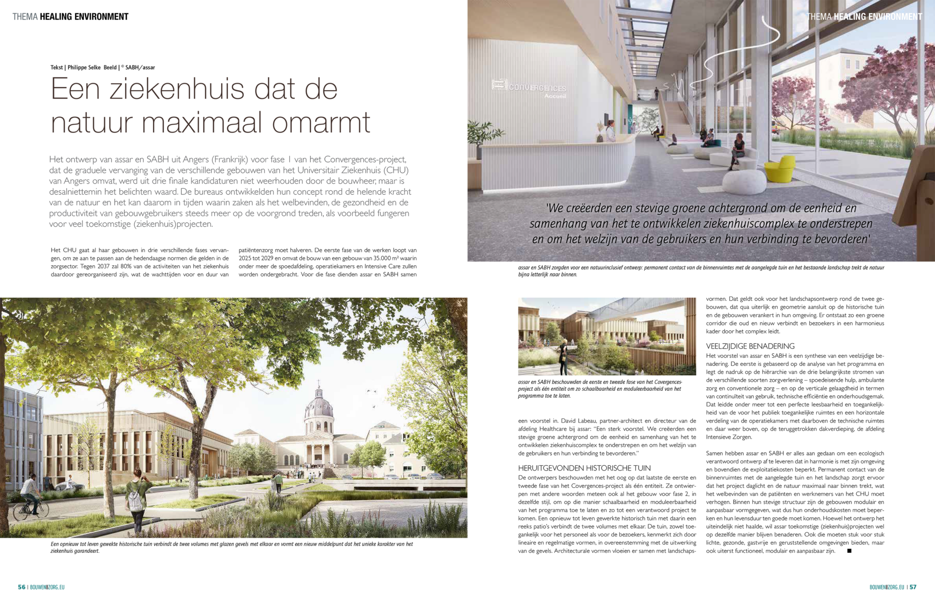 Dans l’édition d’octobre 2023 du magazine “Bouwen aan de Zorg”, assar & SABH ont présenté une conception innovante d’hôpital pour le projet Convergences, mettant en valeur une intégration profonde des éléments de guérison de la nature. Malgré ne pas avoir été sélectionnée, leur proposition pour le Centre Hospitalier Universitaire (CHU) d’Angers reflète une approche visionnaire qui privilégie le bien-être des utilisateurs & la durabilité environnementale.