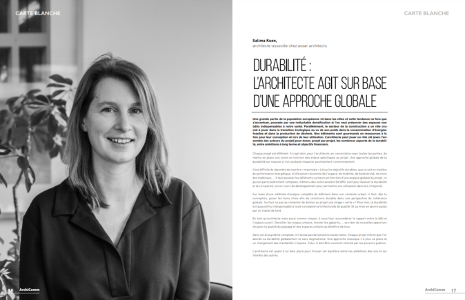 Une grande partie de la population européenne vit dans les villes et cette tendance ne fera que s’accentuer, poussée par une inéluctable densification si l’on veut préserver des espaces non bâtis indispensables à notre santé. Parallèlement, le secteur de la construction a un rôle crucial à jouer dans la transition écologique au vu de son poids dans la consommation d’énergies fossiles et dans la production de déchets. Nos bâtiments sont gourmands en ressources à la fois pour leur conception et lors de leur utilisation. L’architecte peut jouer un rôle clé (avec l’ensemble des acteurs du projet) pour doser, projet par projet, les nombreux aspects de la durabilité, entre ambitions à long terme et objectifs financiers.