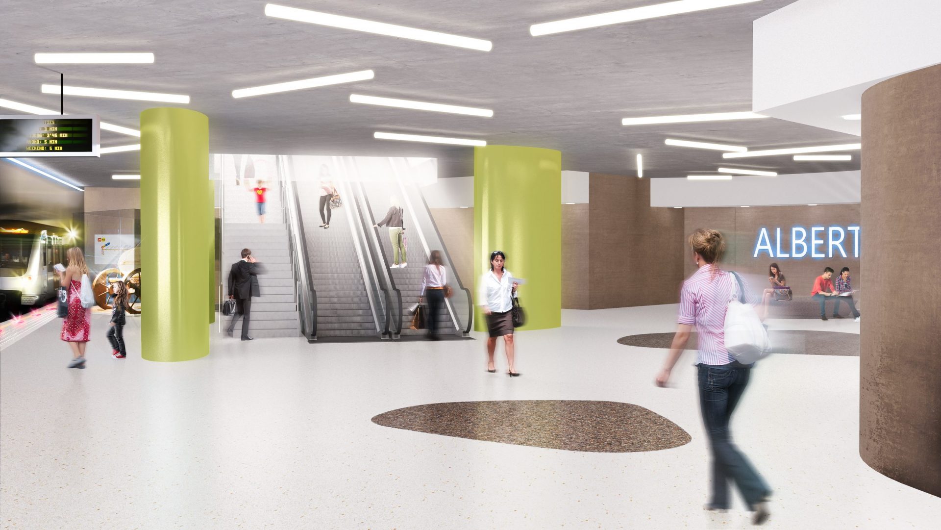 La nouvelle configuration de la Station Albert (usage mixte : Tram – Métro) engendre une intensification et une complexification des flux de circulations. L’objectif du projet architectural vise à fluidifier ces flux en dégageant un sentiment de sécurité et en y développant une personnalité propre. Pour cela, il est prévu d’aménager des zones de convivialité, d’ouvrir des espaces d’accueil, de circulations et d’attentes, de clarifier les flux entre les quais et les niveaux par la transparence et la couleur, d’implanter des commerces de qualité, d’aménager un local à vélos sécurisé, d’atténuer les nuisances sonores et enfin, de mettre en oeuvre des matériaux de parachèvements durables.