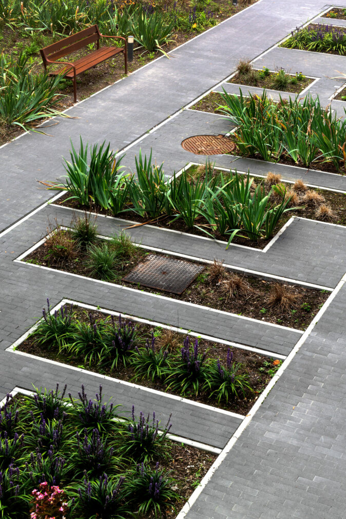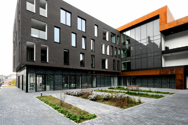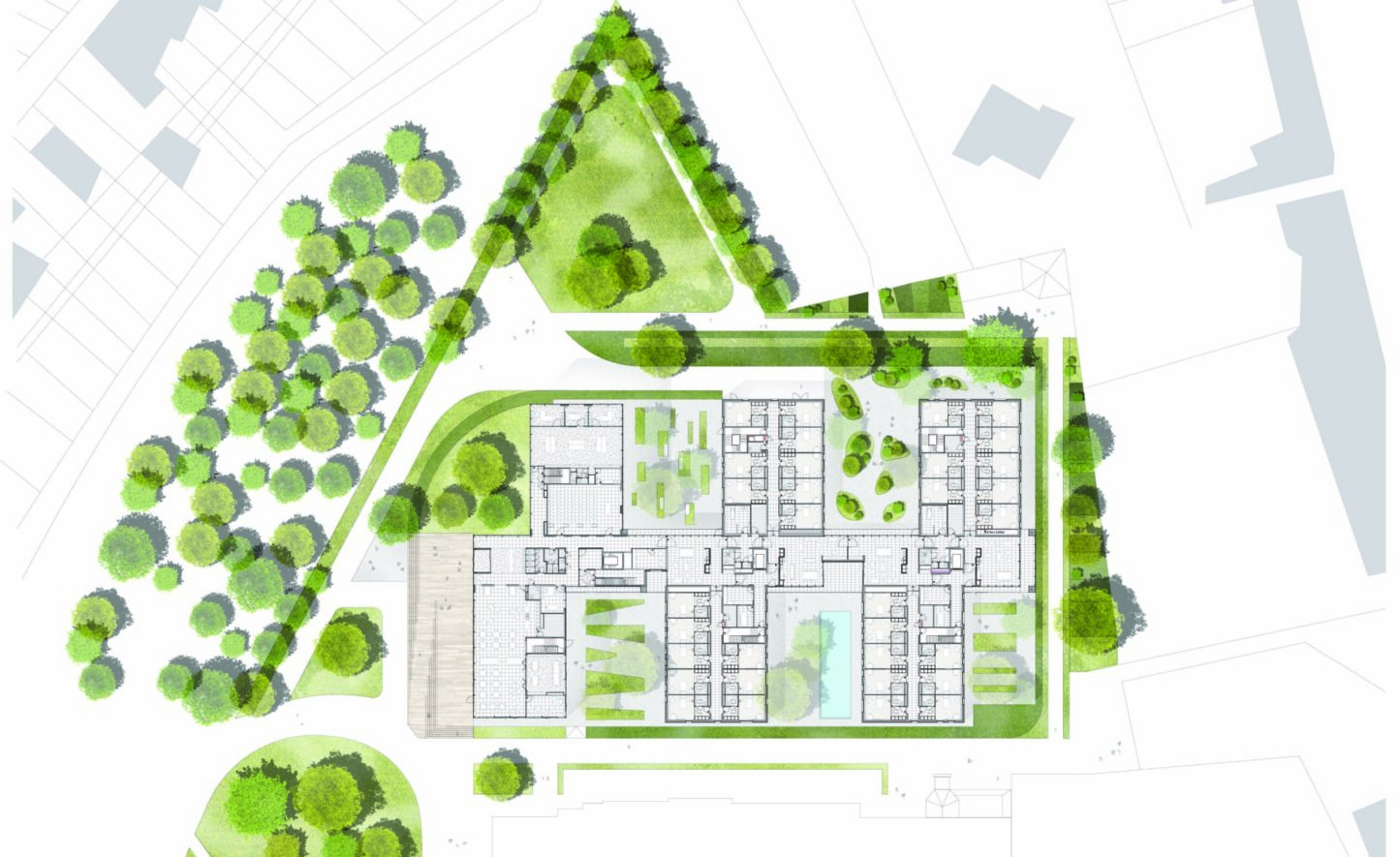 Le site complexe présentait un défi supplémentaire. La superficie assez limitée était largement occupée par les bâtiments du centre de soins résidentiels existant. Ceux-ci étaient en service et ne pouvaient être démolis qu’après le déménagement des résidents dans le nouveau bâtiment. C’est pourquoi le nouveau bâtiment est construit en deux phases.