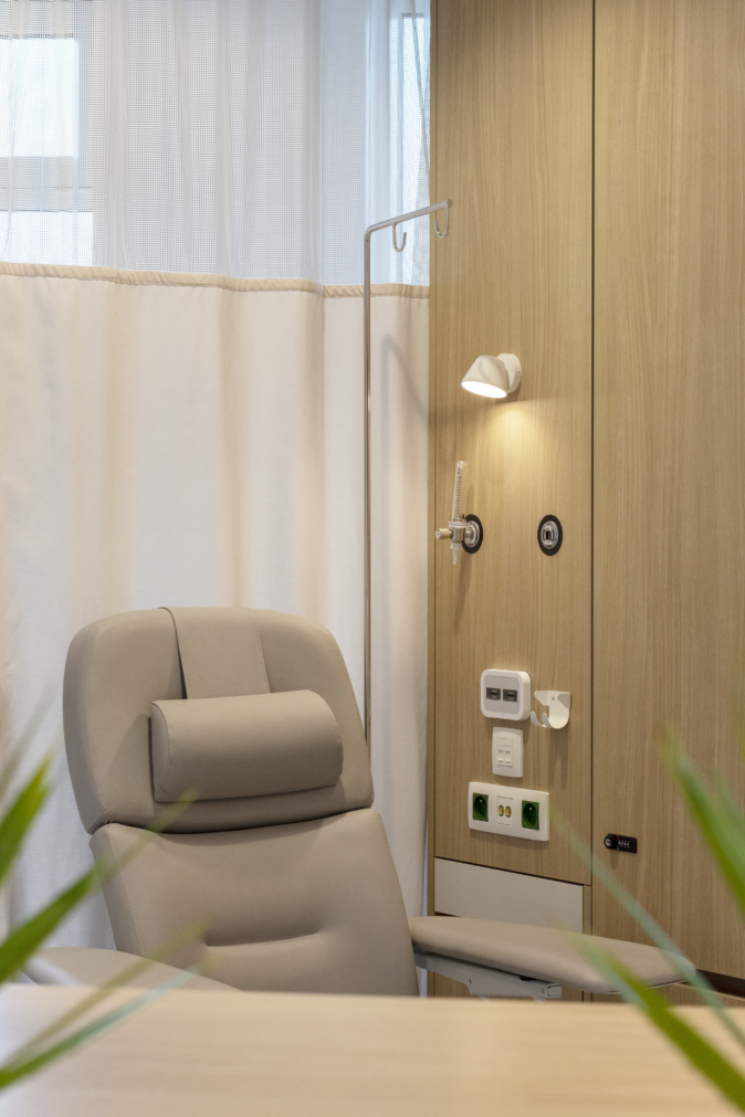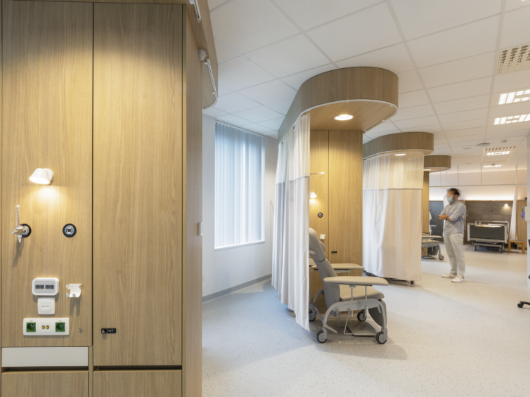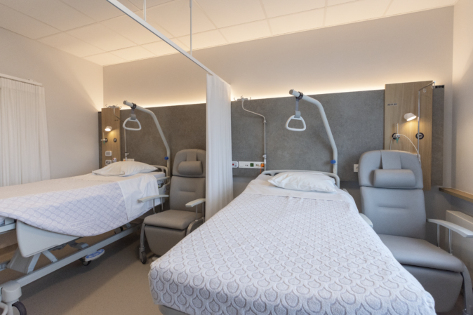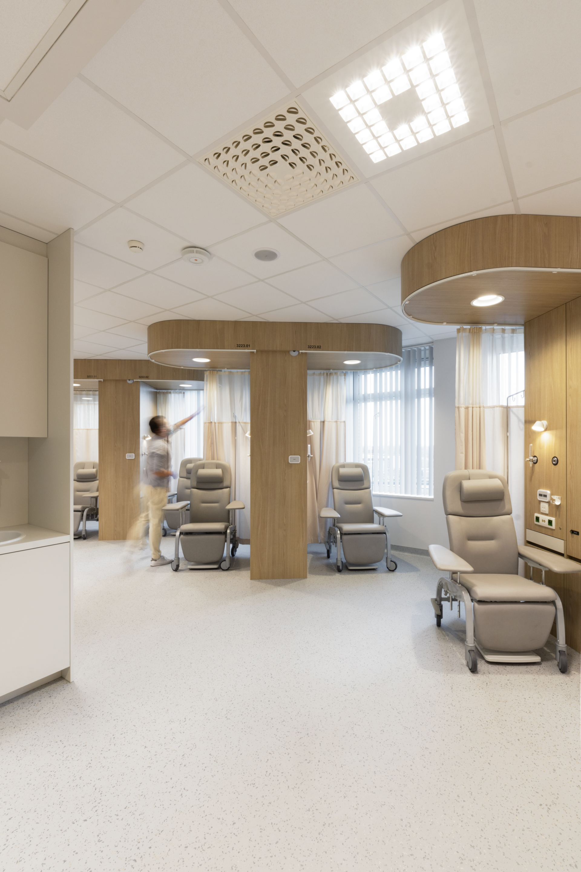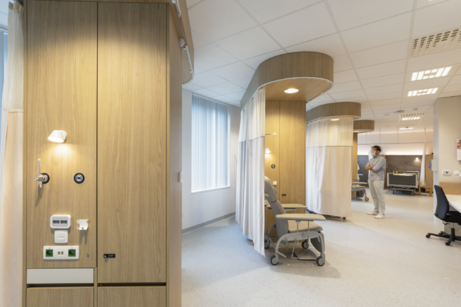Douze personnes peuvent désormais s’asseoir simultanément dans un relax et trois dans un lit. Il reste encore de la place pour une extension. Chaque module peut contenir deux relax. Au besoin, on peut également placer un lit. Chaque relax est équipé d’une tablette extensible, d’une prise (pour recharger un téléphone portable ou un ordinateur portable), d’une liseuse, d’un placard vestiaire et d’un dispositif d’appel malade. Des rideaux garantissent aux patients de pouvoir se changer en toute intimité. En conséquence, la zone de traitement reste un espace ouvert qui peut jouir de la lumière du jour de façon optimale.