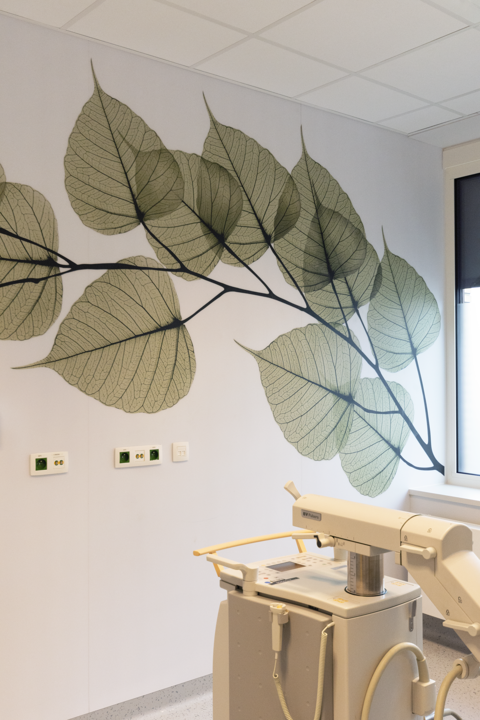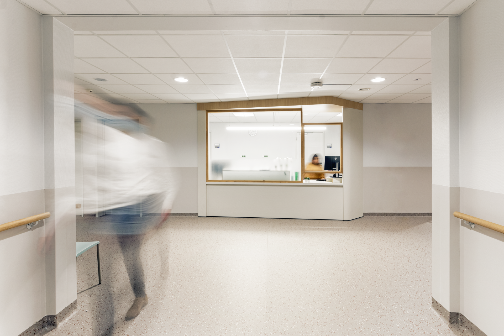 Dans la grande salle de scopie de 28 m², où se déroulent les examens, un revêtement mural en PVC a été posé. Ses motifs sobres font référence à la nature. Le PVC résiste aux petits coups. C’est une nécessité, car le trafic de lits et de chariots est dense dans ce lieu. Du plomb a été placé dans les murs pour contrer les rayons potentiellement nocifs de l’équipement. Le sol en PVC est antistatique et l’ouverture et la fermeture de la porte coulissante en plomb se font sans contact. Ainsi, nous nous efforçons d’obtenir une architecture inspirante et évolutive dans sa forme et accessible à tous. Une architecture inclusive, donc.