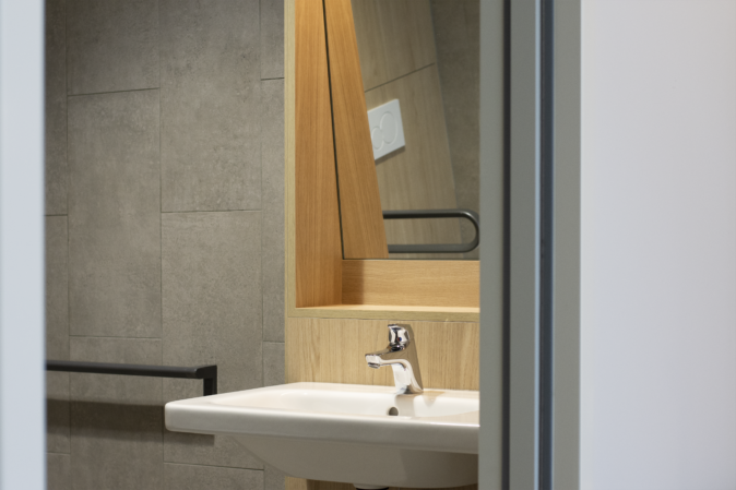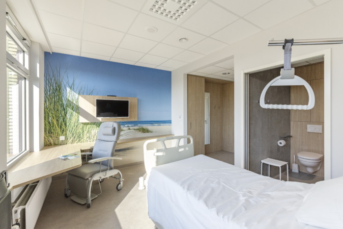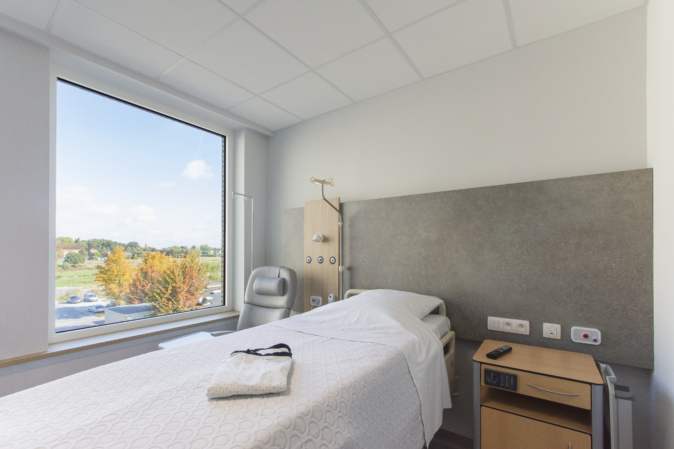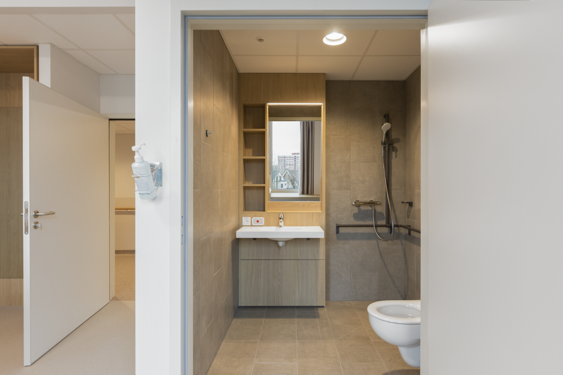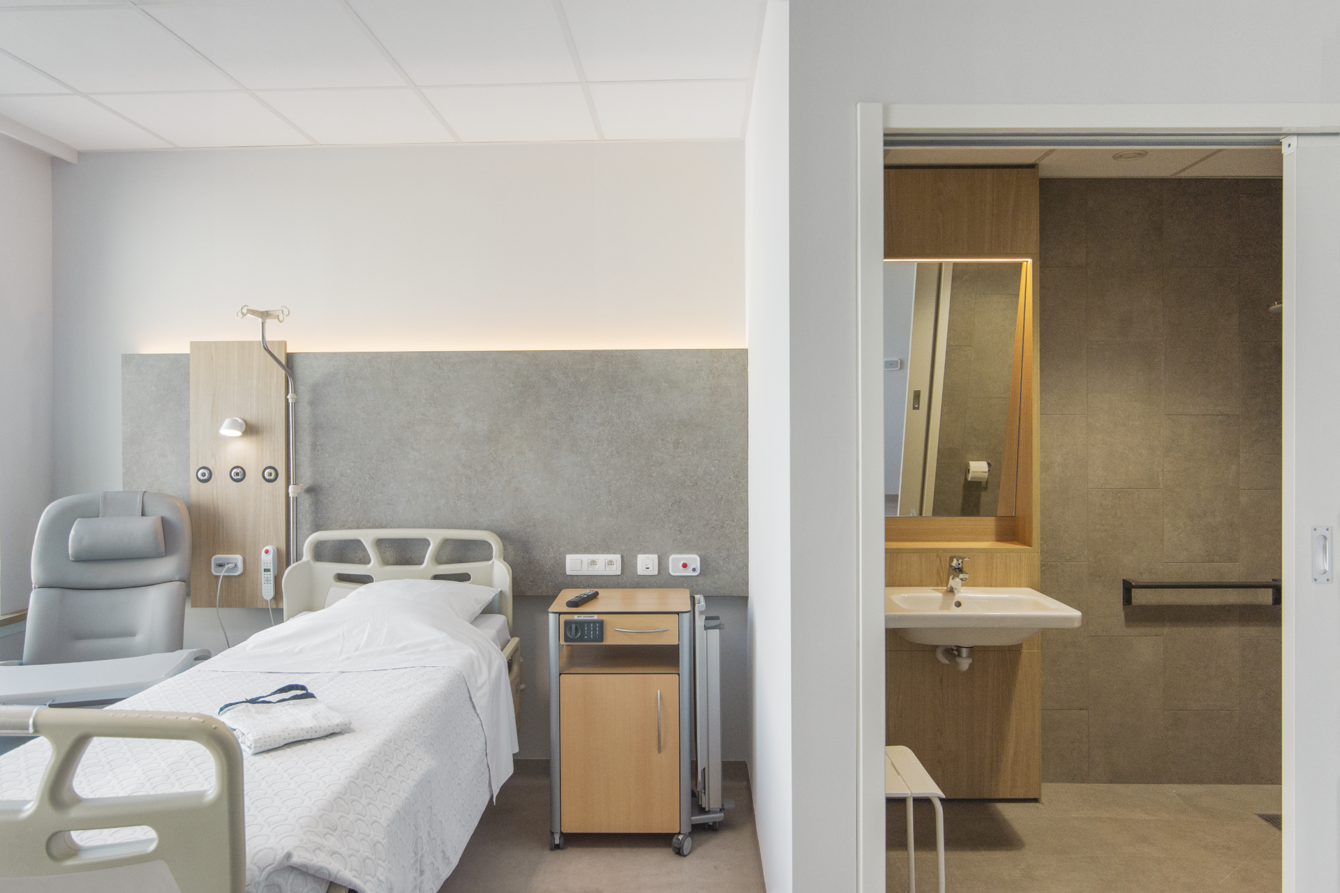 Les tablettes de fenêtre sont larges, de sorte qu’elles peuvent également faire office de tablettes de salle à manger. Ce département compte sept chambres individuelles, sept chambres doubles, deux chambres d’isolement et une chambre de soins palliatifs. Cette dernière chambre donne accès, par une porte coulissante, à un salon, où l’on peut recevoir confortablement amis et parents. Toutes ces chambres disposent d’un dressing avec frigo et coffre-fort ainsi que d’une cellule sanitaire avec douche, w.c. et lavabo. Les chambres doubles sont dotées de deux lavabos.