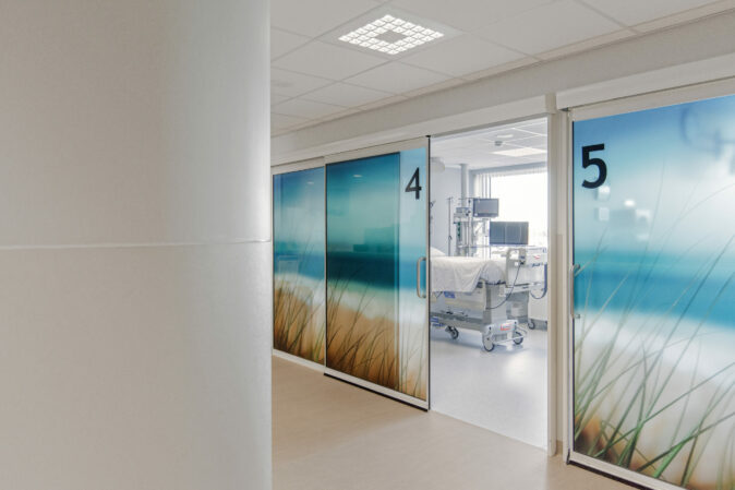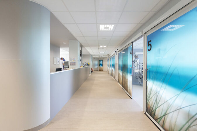 Le département infirmier attenant, avec ses chambres et son poste d’infirmerie avec salle de médication et d’utilitaires, est d’un design classique. Mais là encore, nous avons opté pour une finition en motifs bois clair avec des images de la nature. Cela crée une ambiance chaleureuse.