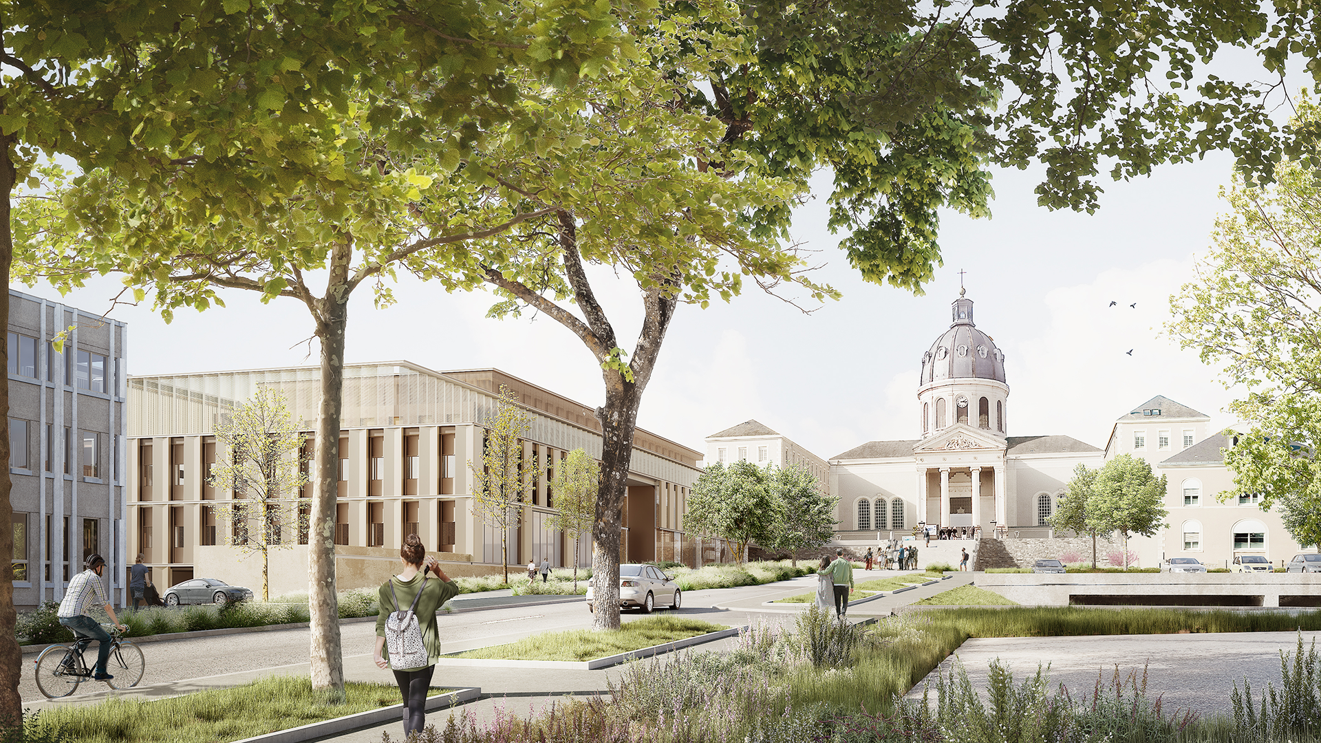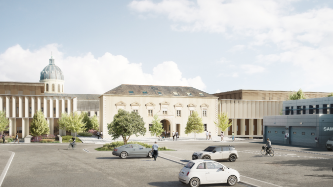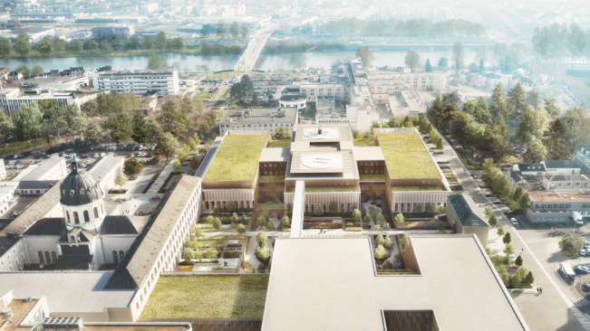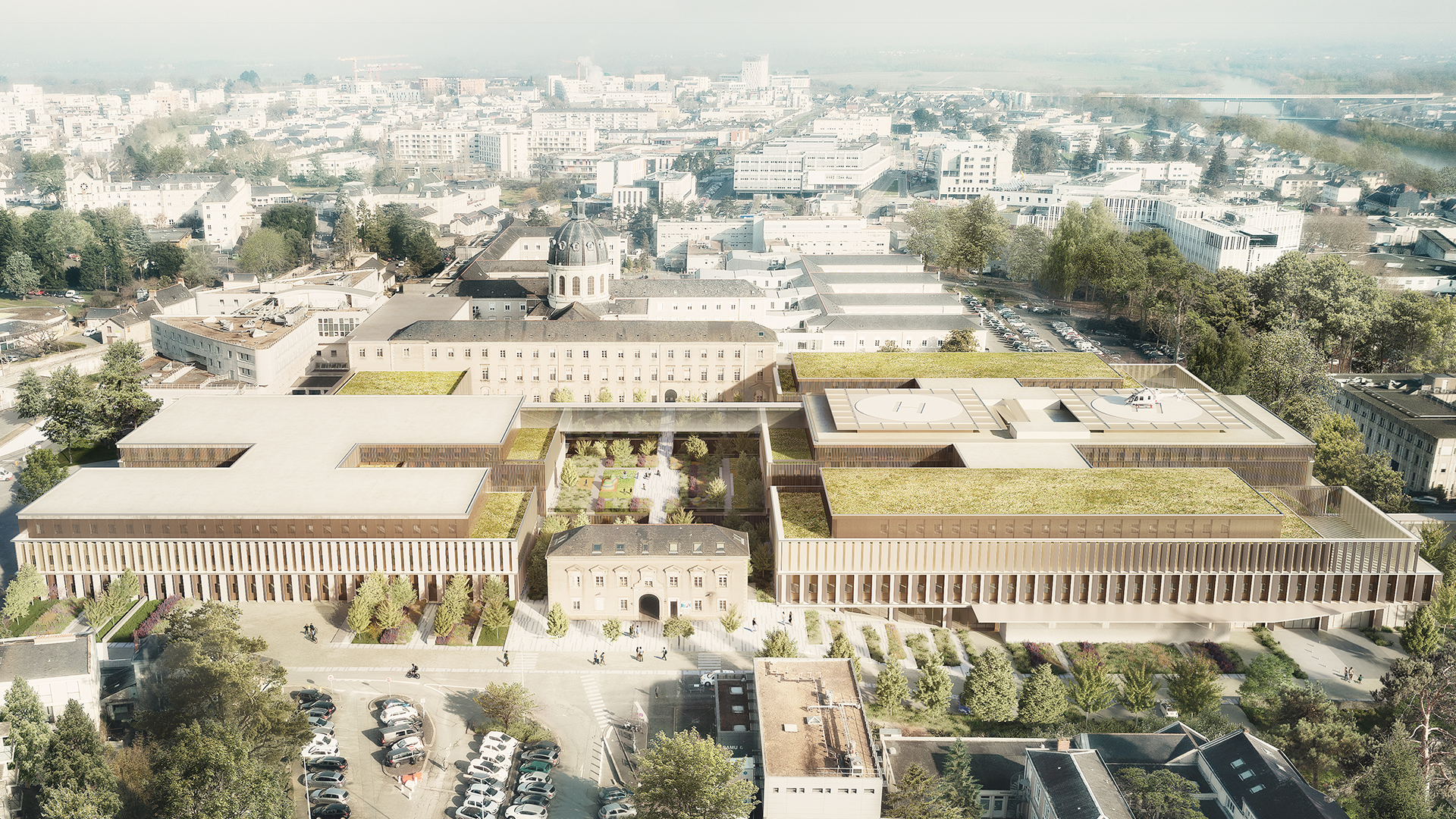 D’une part, affirmer la présence de l’accueil ambulatoire au nord depuis l’axe historique du CHU et sa Chapelle pour une évidence de fonctionnement à l’échelle du site. Dans une logique de symétrie, l’implantation du bâtiment initie l’écho formel avec l’Hôtel Dieu Nord et un Hall central accessible nord au sud.