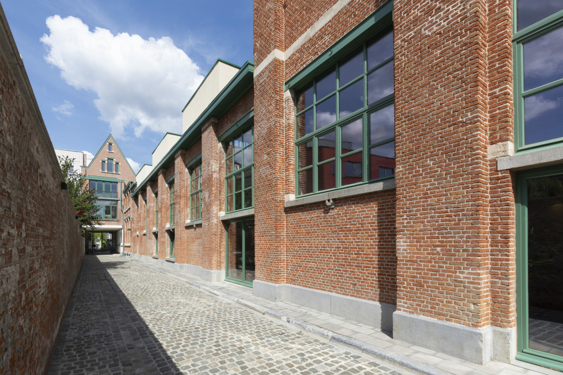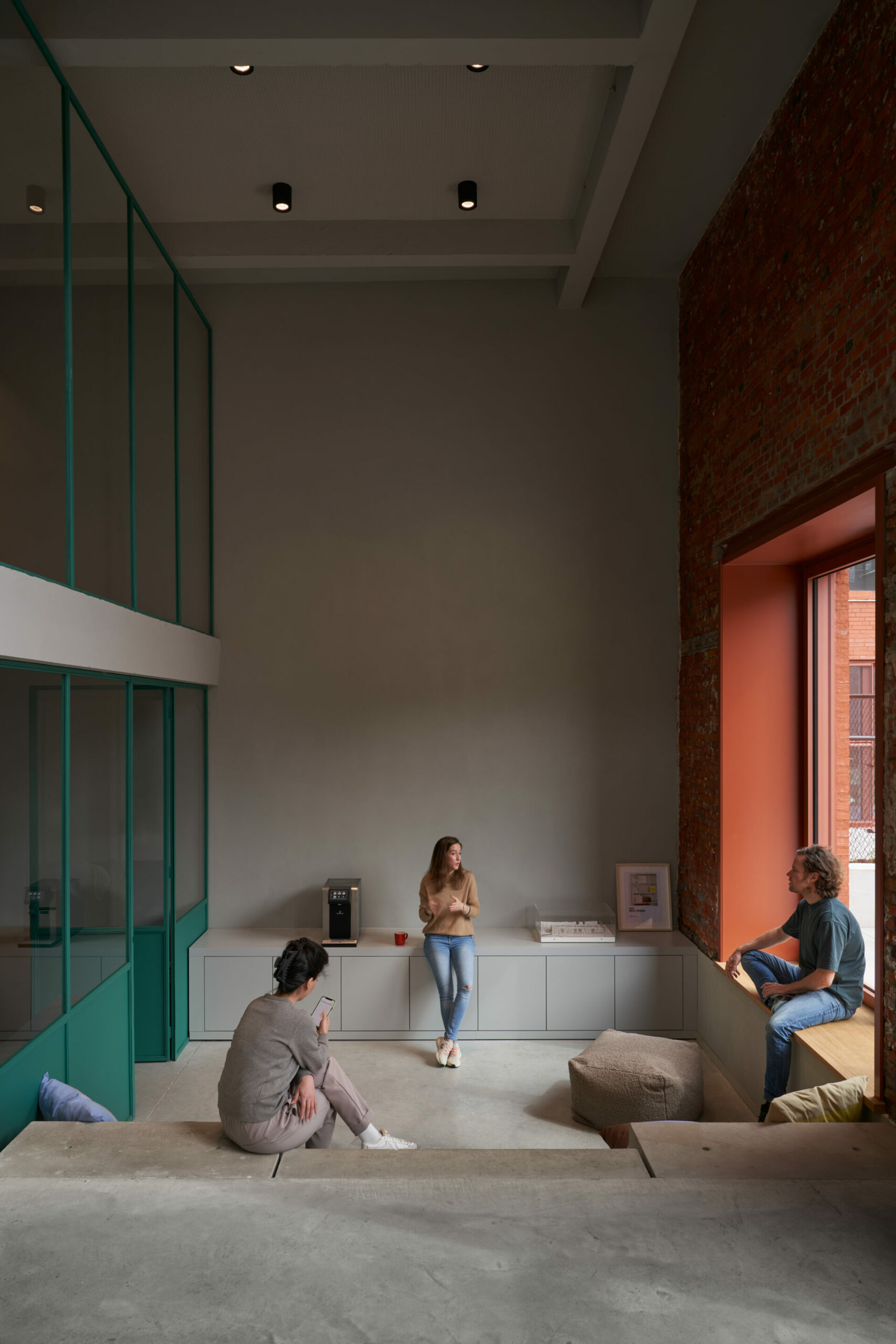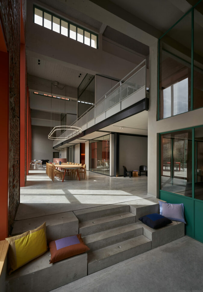 L’aménagement intérieur est greffé au maximum sur l’enveloppe environnante, avec le vert et la terre cuite comme teintes dominantes, auxquelles s’ajoutent des nuances de gris. La couleur verte a été imposée par le patrimoine car c’était la couleur d’origine des menuiseries extérieures en bois le long de la ruelle. La couleur rouge a été choisie par les architectes de Bold pour les fenêtres et les façades des nouvelles parties du bâtiment, afin de faire ressortir les parties patrimoniales.
