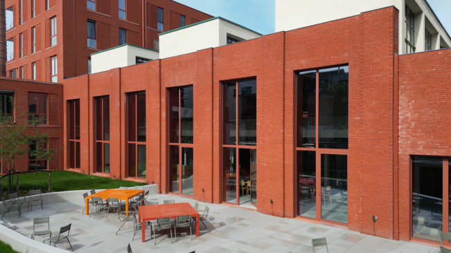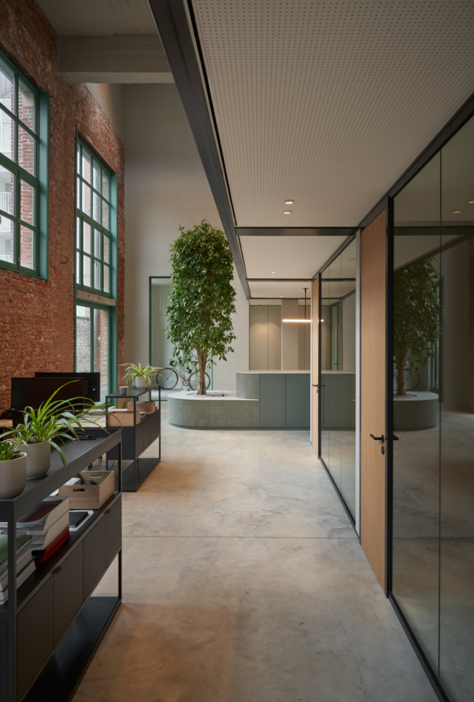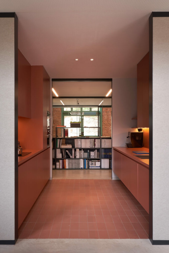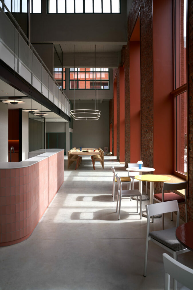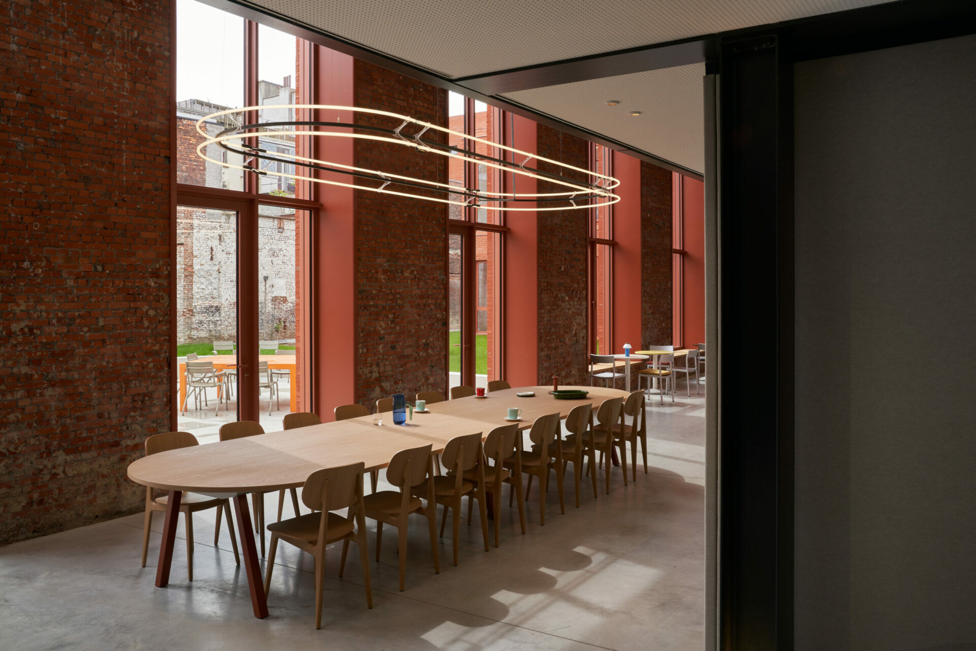 L’aménagement intérieur est greffé au maximum sur l’enveloppe environnante, avec le vert et la terre cuite comme teintes dominantes, auxquelles s’ajoutent des nuances de gris. La couleur verte a été imposée par le patrimoine car c’était la couleur d’origine des menuiseries extérieures en bois le long de la ruelle. La couleur rouge a été choisie par les architectes de Bold pour les fenêtres et les façades des nouvelles parties du bâtiment, afin de faire ressortir les parties patrimoniales.