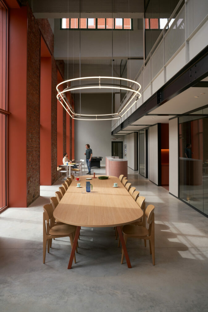 L’éclairage a été réalisé en collaboration avec Modular Lighting Instruments. Le principal élément qui attire l’attention est le grand néon situé au-dessus de la table à manger, qui est flanqué des immenses fenêtres de la façade rénovée et à travers lesquelles la lumière évolue tout au long de la journée.