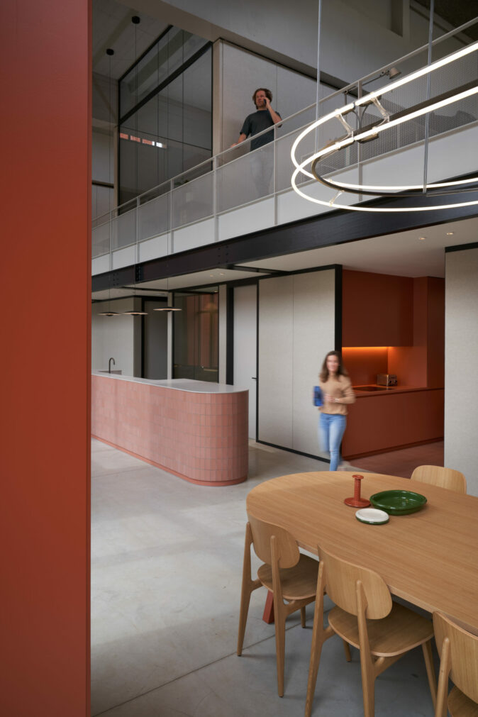 La palette de couleurs se reflète, entre autres, dans le nouveau sol en polybéton et les murs acoustiques rembourrés (gris), le carrelage du bureau de l’entrée (vert) et le comptoir de la salle à manger (terracotta), ainsi que dans la couleur de la cuisine (terracotta). Un bon équilibre a été recherché, en combinaison avec l’acier noir et les accents de bois chauds.
