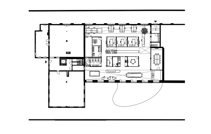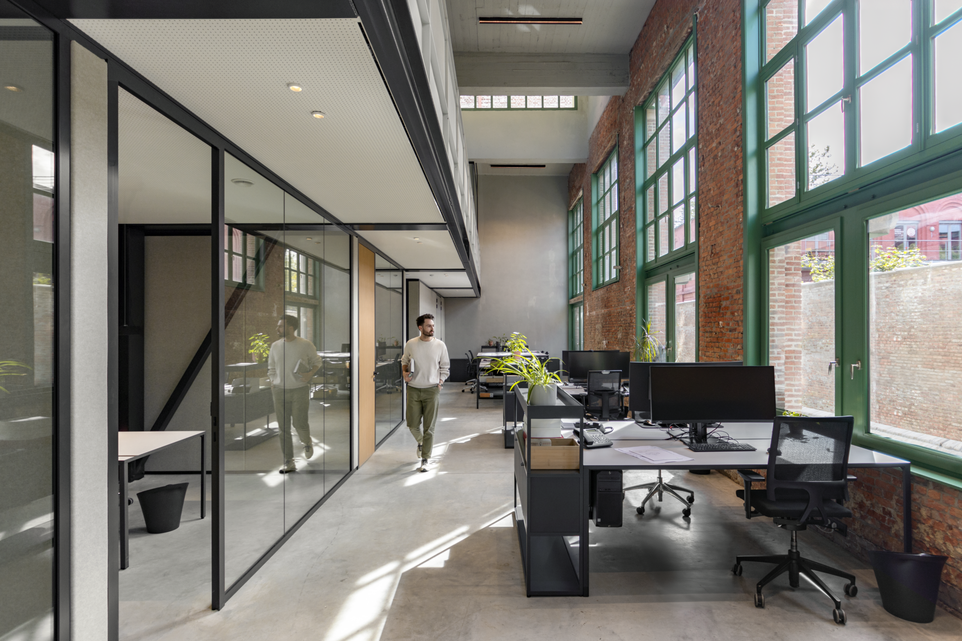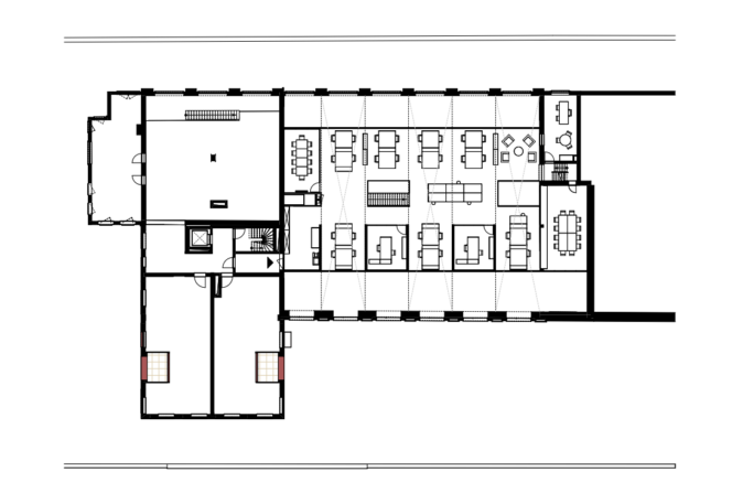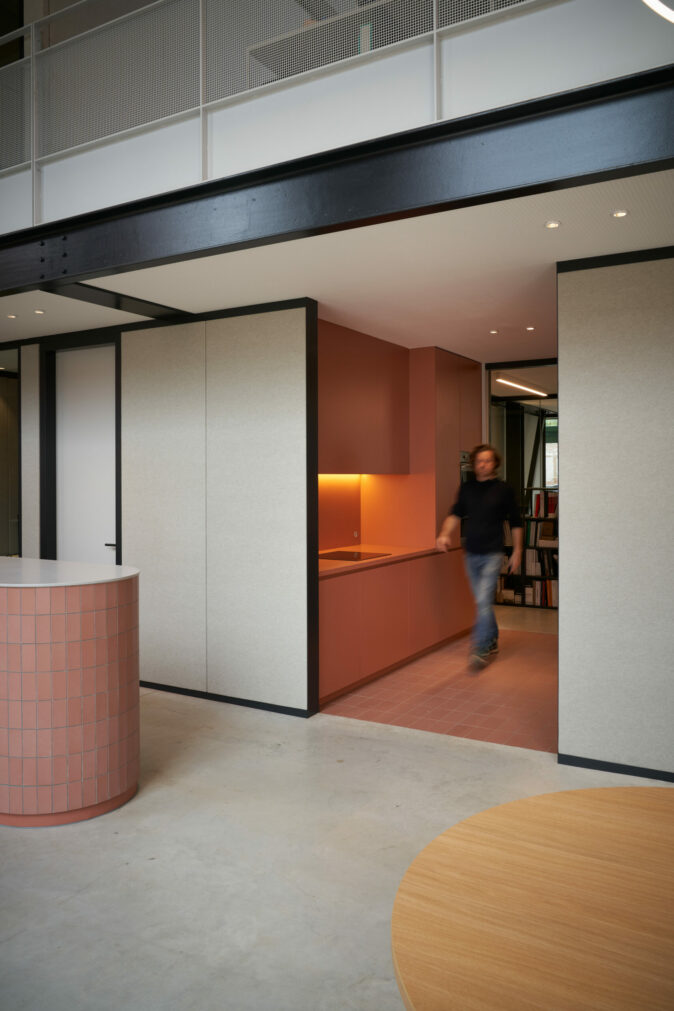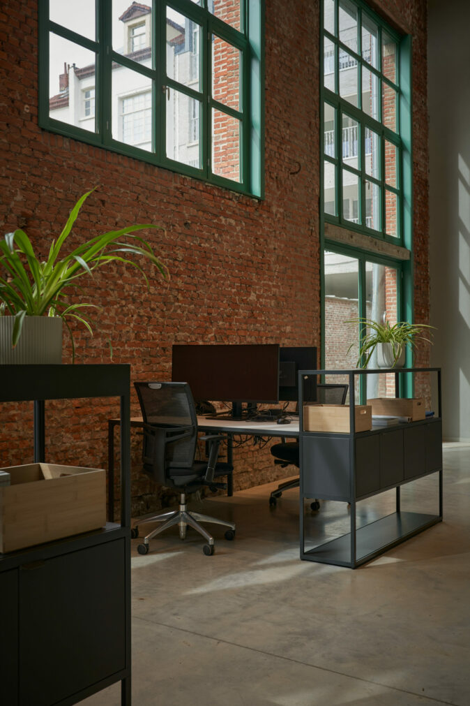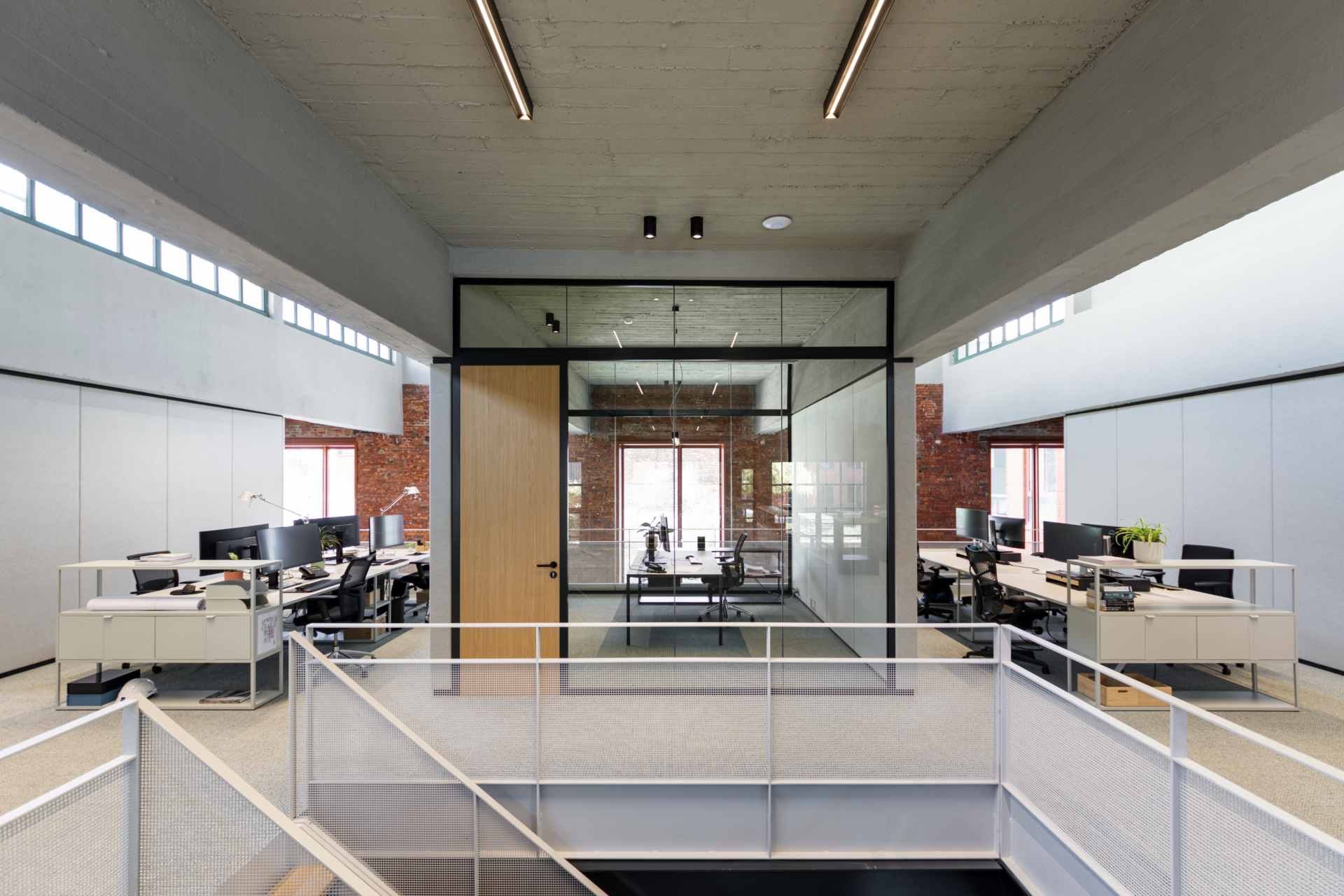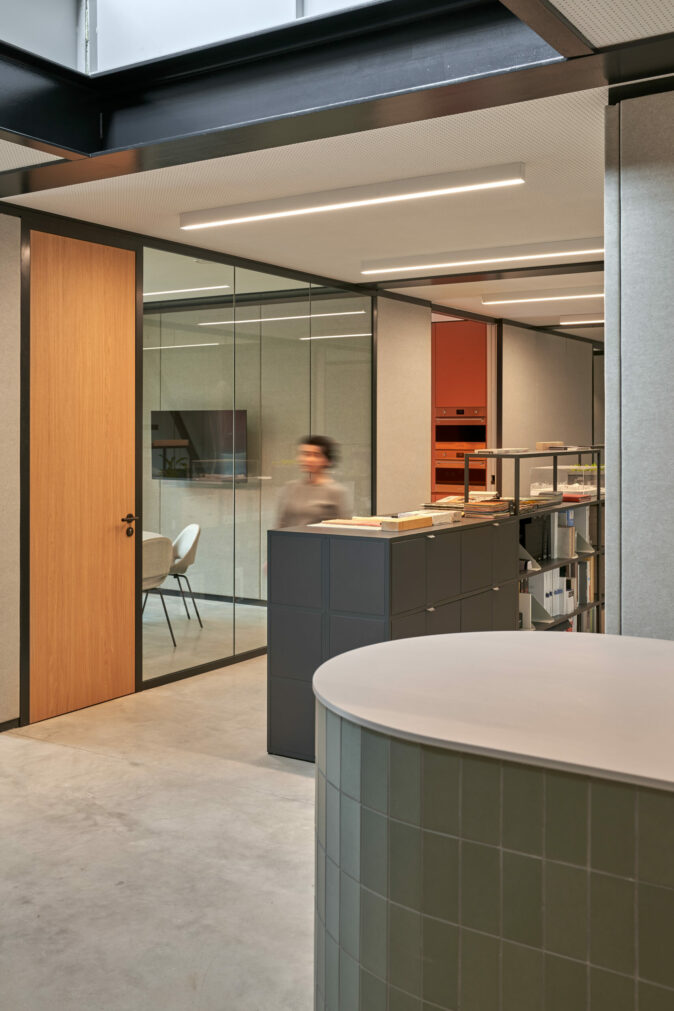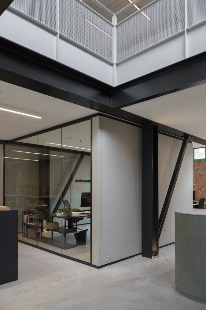 L’aménagement de l’espace a été conçu de manière flexible. Au rez-de-chaussée, la structure noire de la mezzanine a été principalement occupée par des bureaux individuels, grâce à une combinaison de parois vitrées (dans le sens longitudinal) et de parois acoustiques rembourrées (dans le sens transversal), afin de créer autant de vues latérales que possible d’une façade à l’autre.