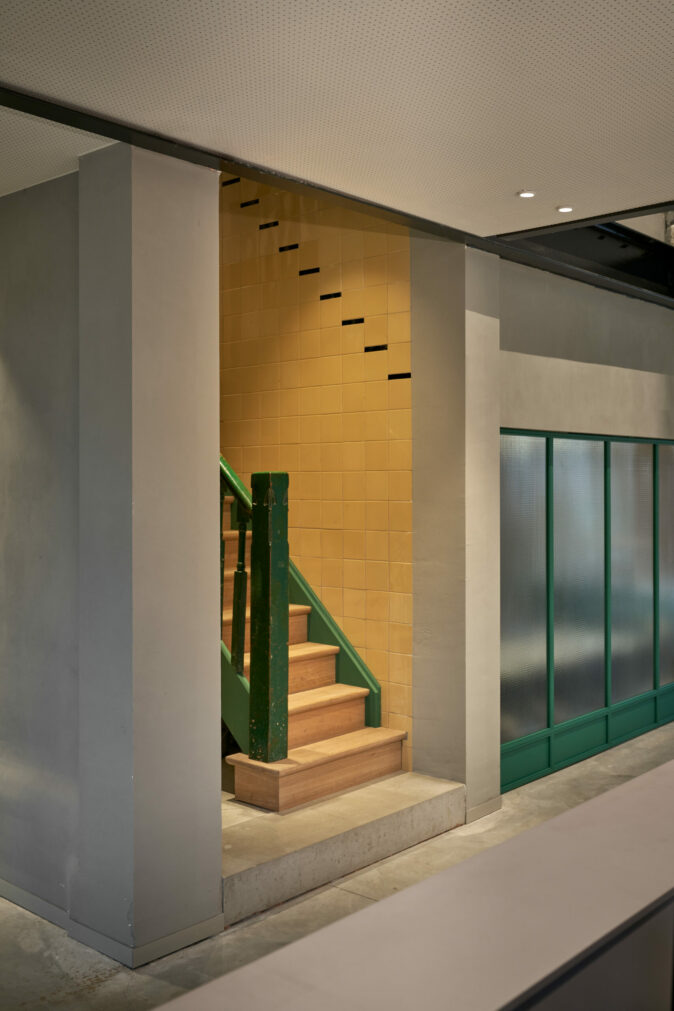 En outre, assar souhaitait refléter certains éléments historiques dans l’intérieur des nouveaux bureaux. Les plafonds en béton ont été conservés, de même qu’une ancienne cage d’escalier, avec ses carreaux muraux authentiques et sa rampe d’escalier ornée de silhouettes sculptées de boutons d’or, qui rappellent que le bâtiment a été construit en 1905 en tant que beurrerie. Le directeur actuel a depuis emménagé dans le bureau de la direction, qui donne sur le hall de l’usine par une grande fenêtre.