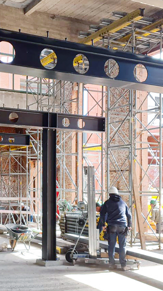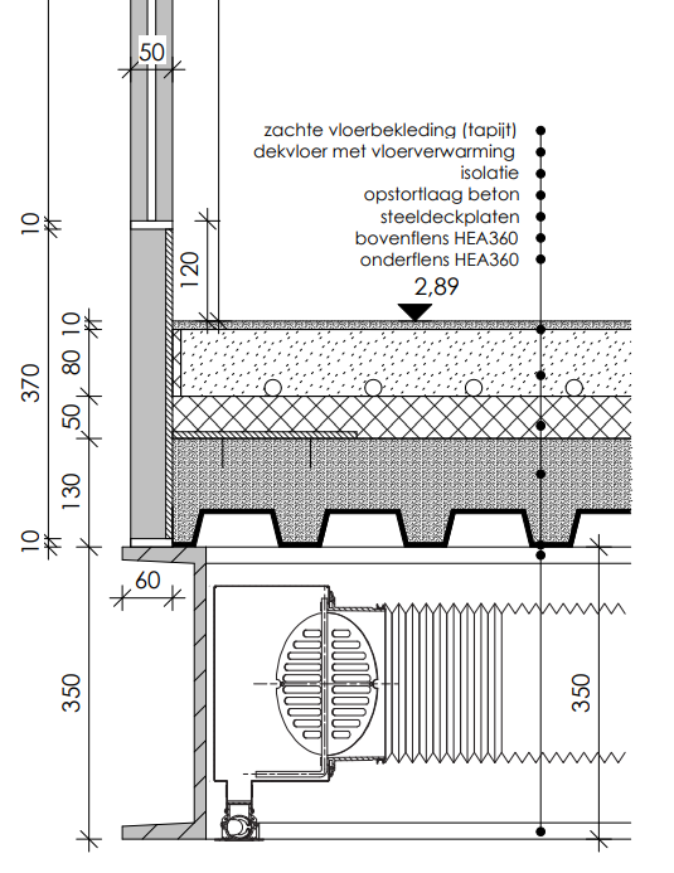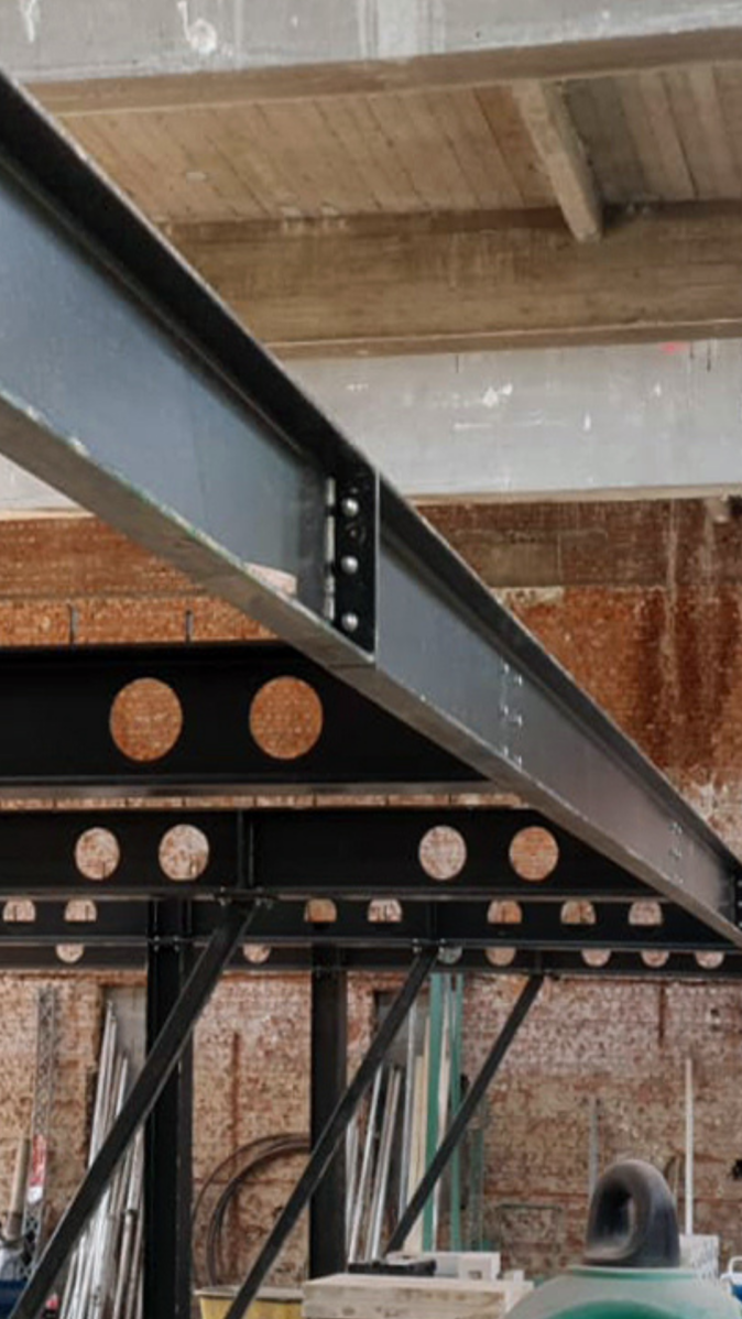 La structure de la mezzanine est composée de poutres perforées avec un couronnement périphérique, des colonnes et des poussoirs angulaires qui ont permis la création d’un étage intermédiaire maximum en supportant un porte-à-faux de 3,5 mètres. L’acier a été entièrement peint en noir et délibérément surdimensionné pour offrir une résistance au feu suffisante sans peinture Rf. Ce surdimensionnement a d’ailleurs aussi une raison esthétique. Le bâtiment date de 1905, au milieu de la période de l’Art nouveau, qui se caractérisait par un design prononcé des éléments structurels (en acier). Assar architects s’en est inspiré et a cherché à savoir comment l’acier pouvait ajouter de la valeur à l’intérieur. L’acier profilé a donc été surdimensionné de manière à ce que les brides inférieures restent visibles et que les profilés en C aux extrémités bordent l’ensemble du plancher. Un projecteur de sol a été intégré à la base de chaque poutre en I pour mettre littéralement la structure en valeur la nuit.
