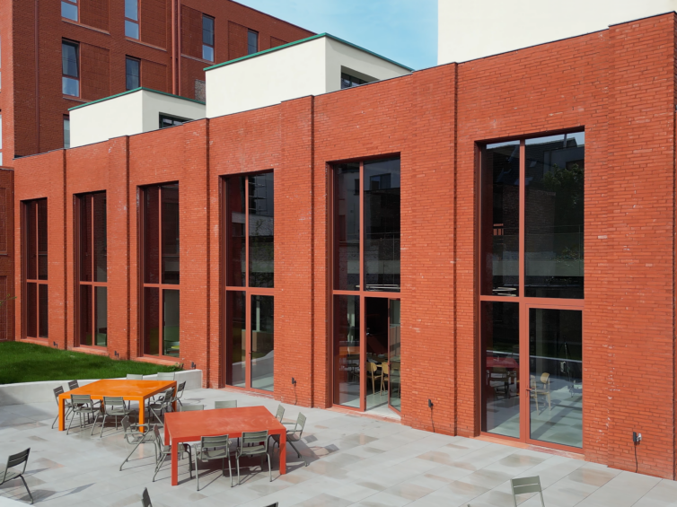 Le hall d’usine se composait d’un volume ouvert d’environ 900 m² et de 8 mètres de haut, avec une façade protégée en briques avec des menuiseries vertes d’un côté (conformes aux plus anciennes couches de peinture retrouvées) et une façade rénovée avec des menuiseries de couleur terre cuite de l’autre côté, correspondant à l’aspect des briques rouges des volumes voisins construits à neuf.