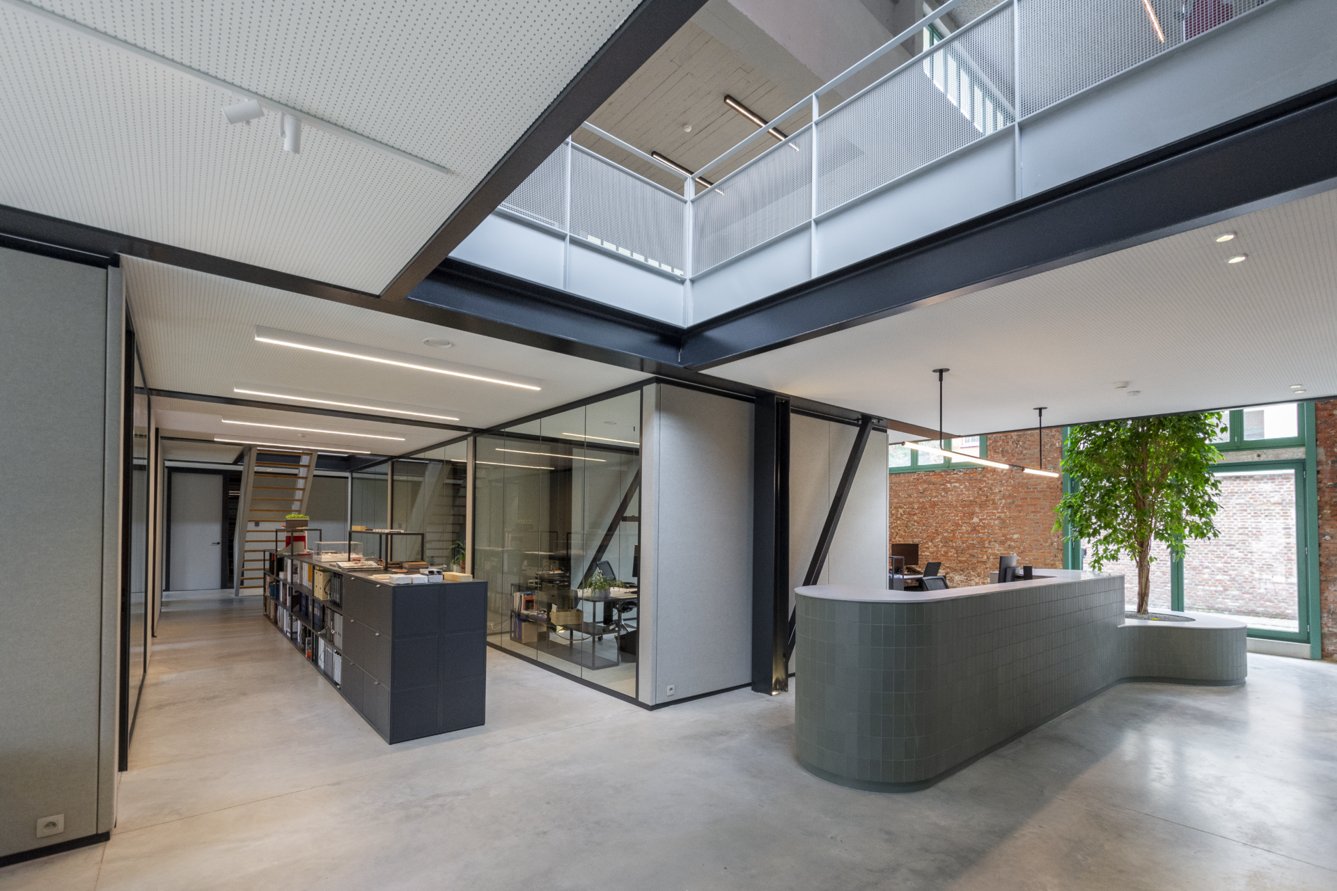 En outre, des efforts maximaux ont été déployés en matière de confort et de convivialité afin de créer une atmosphère de travail agréable, l’acoustique étant au centre des préoccupations. Outre les murs transversaux rembourrés, les plafonds en plâtre perforé au-dessus du rez-de-chaussée de la mezzanine, la moquette au niveau du sol et le plâtre pulvérisé gris au sommet du hall y contribuent également. Dans un environnement industriel brut comme celui-ci, la création d’un climat acoustique agréable n’est pas une mince affaire, mais le résultat est excellent.