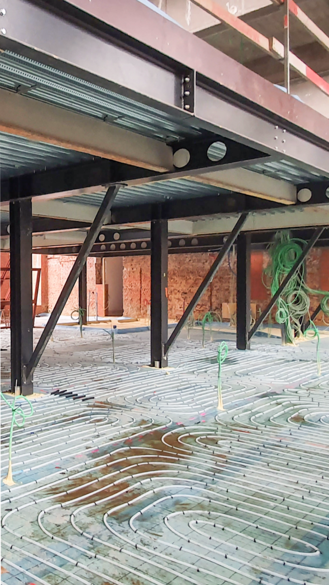 Sous le bâtiment se trouve un nouveau parking souterrain, de sorte que les points où les colonnes de la nouvelle structure en acier pouvaient être placées étaient fixes. Ces points ont été utilisés de manière créative pour créer la symétrie nécessaire entre les deux espaces vides, notamment par l’ajout de « poussoirs » angulaires. En outre, les murs ont été placés non pas sur mais juste à côté de la structure, laissant les colonnes peintes en noir visibles, ce qui a permis d’intégrer l’ensemble de la structure en acier à l’esthétique générale de l’intérieur.