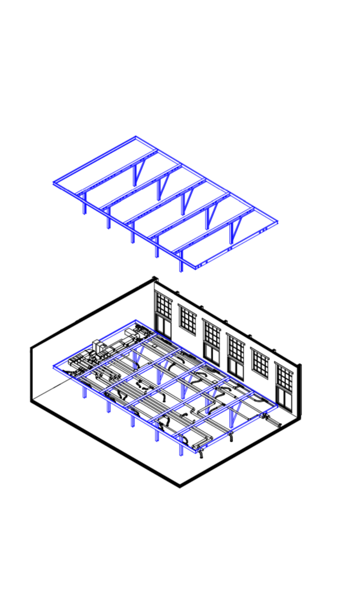 Afin d’utiliser au mieux l’espace disponible sans détruire le caractère authentique de l’ancien hall d’usine, une mezzanine allongée en acier a été intégrée. Cette solution tient compte de la demande de l’Agence du patrimoine de créer deux grands vides sur les façades longitudinales, préservant ainsi la grandeur de l’ensemble.