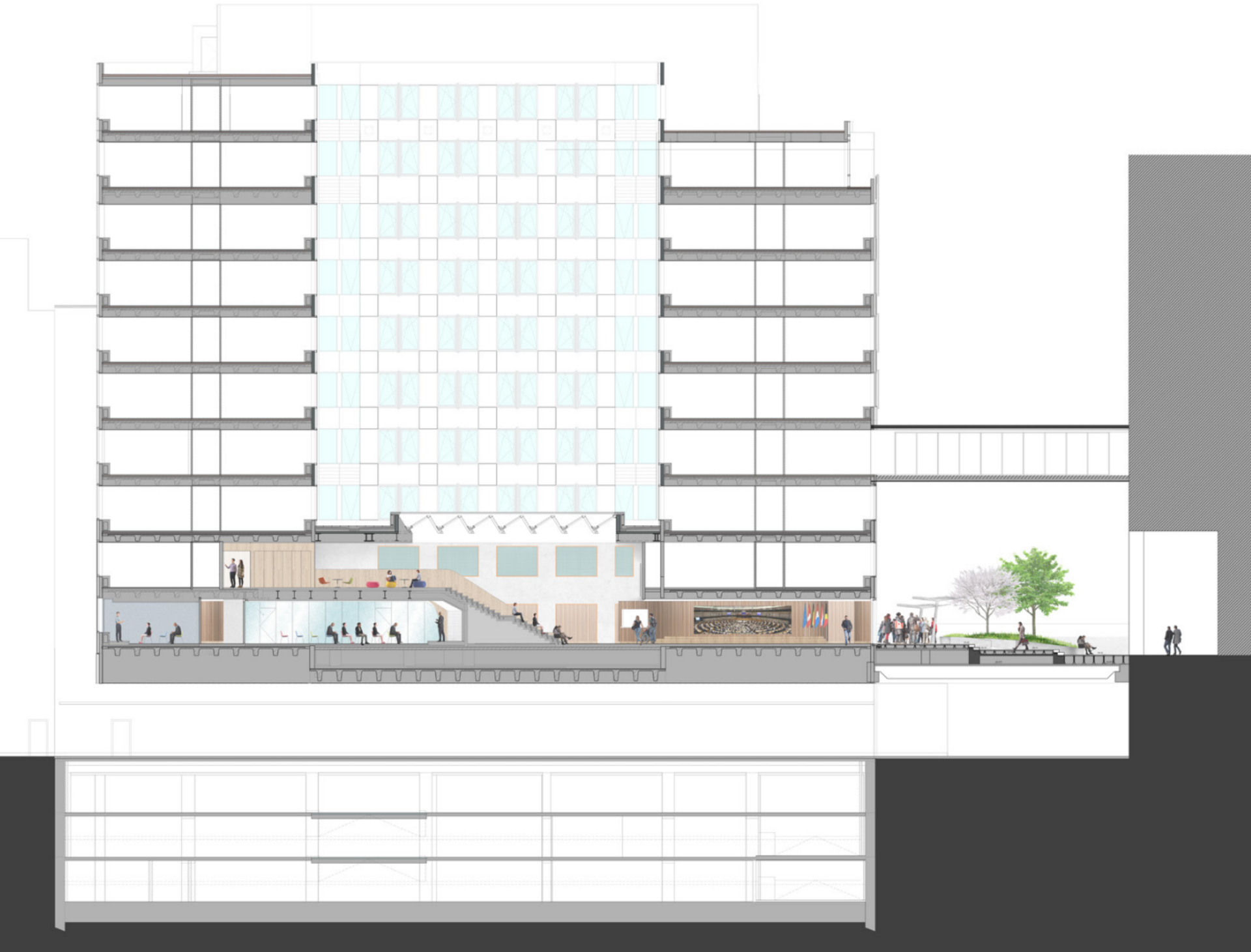Le projet consiste à aménager 11 salles de conférence, une zone back office et un sas de sécurité à l‘entrée du bâtiment avec la création d’un nouvel accès sur la façade Montoyer par un nouvel espace extérieur sur dalle.
