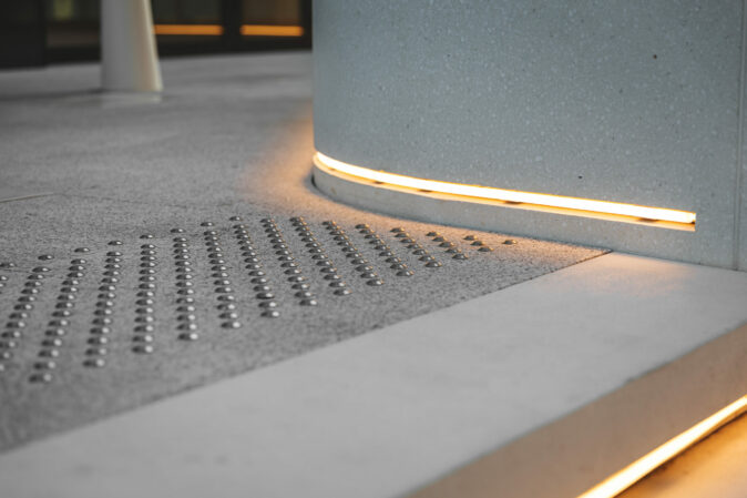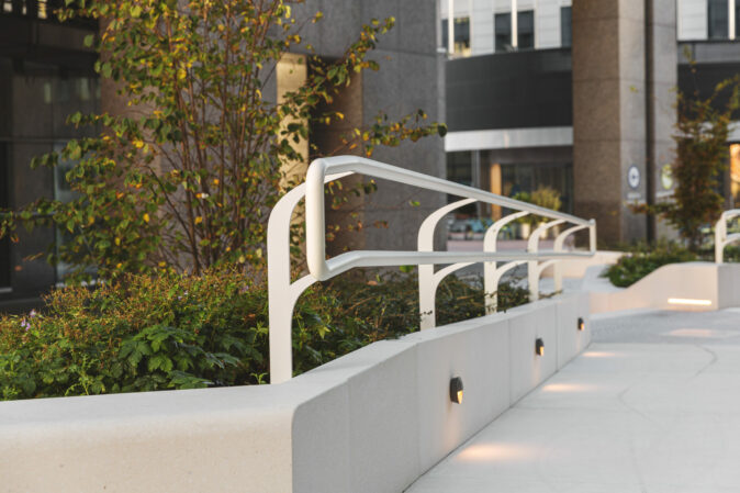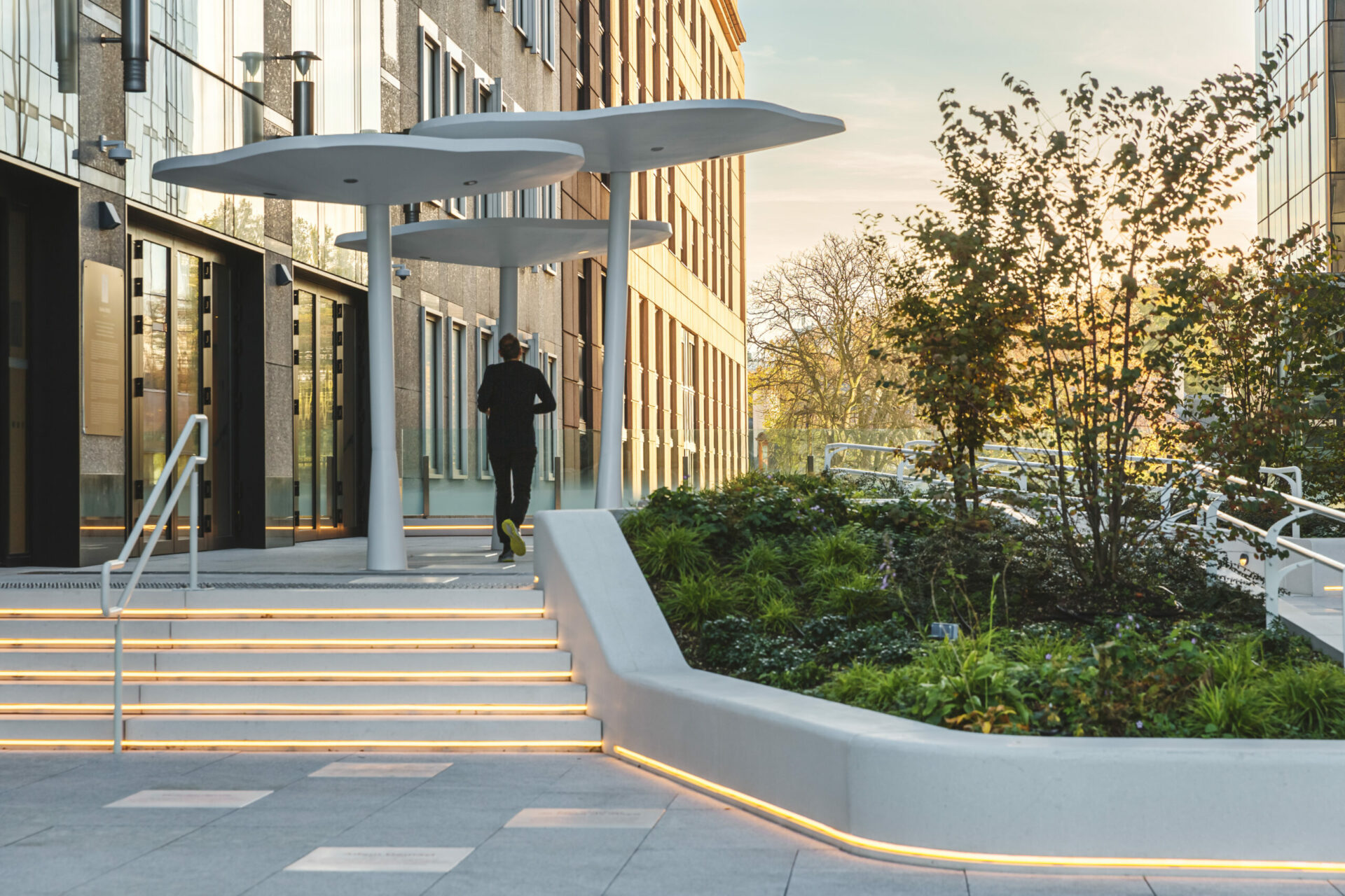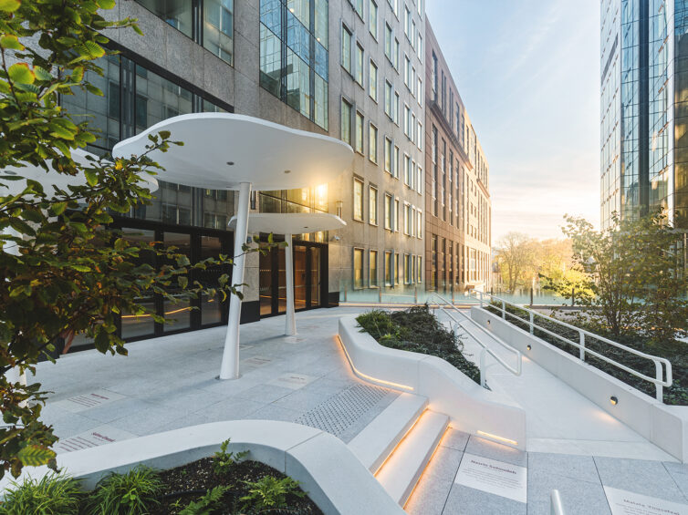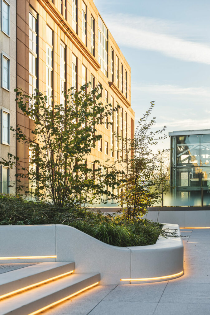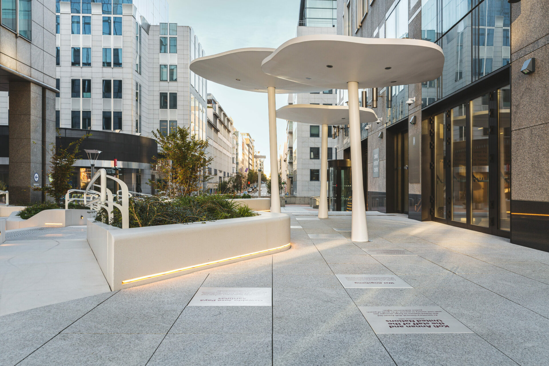 De grandes jardinières en béton architectonique blanc servant également de bancs ont été disposées en tenant compte des principaux flux de et vers les points d’intérêts du parcours du visiteur. Elles apportent une respiration verte tout en invitant à entrer dans le bâtiment. Trois élégants auvents protègent les visiteurs des intempéries. Les niveaux ayant été remontés pour correspondre à ceux de l’intérieur, les îlots de verdure sont percés d’une rampe d’accès pour les PMR, le Parlement se voulant une institution inclusive.