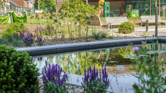 Le jardin supérieur comprend des zones d’activités, tels qu’une plaine de jeux, un terrain de pétanque, la possibilité de créer des petits potagers collectifs, en alternance avec des ambiances plus calmes favorisées par la zone centrale engazonnée et la pièce d’eau.