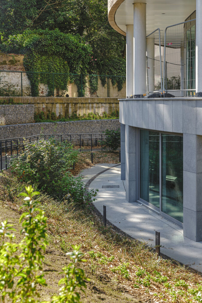 Les abords s’implantent en arc de cercle, latéralement à la rotonde de la maison de repos. Ils se composent :