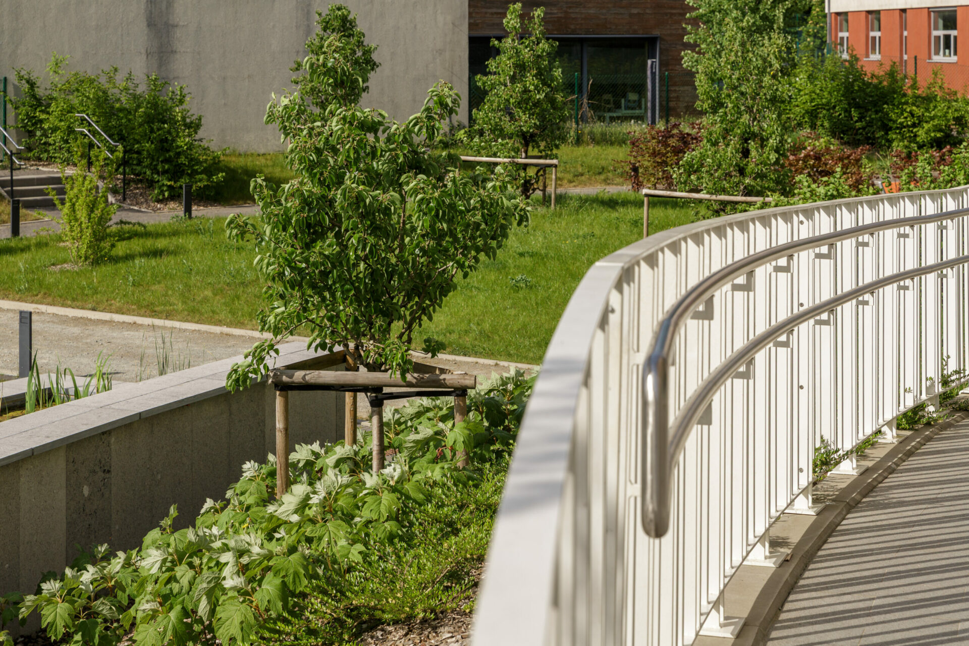 Le bâtiment est implanté en retrait par rapport à l’alignement public. Ce « parvis paysager » est aménagé avec des zones plantées et des parties minérales donnant accès à l’entrée principale et offrant une rampe d’accès aux personnes à mobilité réduite (PMR).