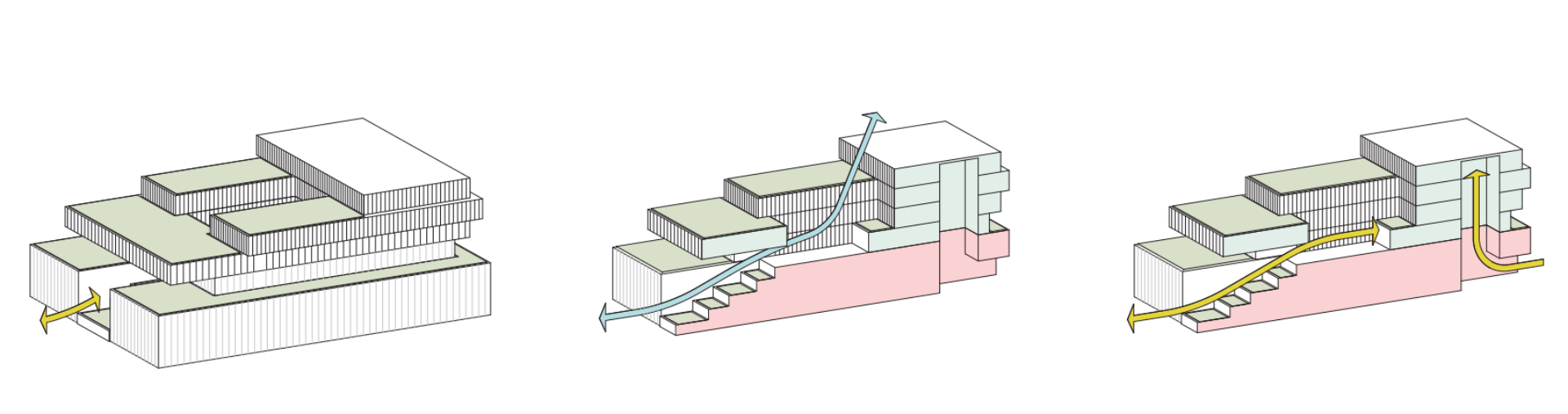 La position des trois éléments (scène (escalier) d’expérience, atrium et entrée principale) crée un rapport agréable entre hauteur-profondeur.Ces proportions garantissent un bureau traversant de qualité exceptionnelle. Cela rend la conception du bureau non seulement intéressante pour un futur utilisateur en tant que locataire unique, mais grâce à sa flexibilité et sa diversité, elle offre également la possibilité d’accueillir une variété d’entreprises. Les espaces extérieurs à différents niveaux renforcent encore davantage cette flexibilité.