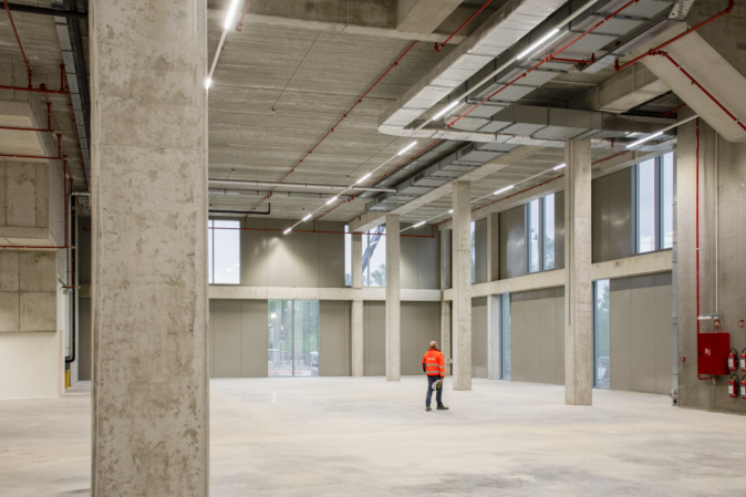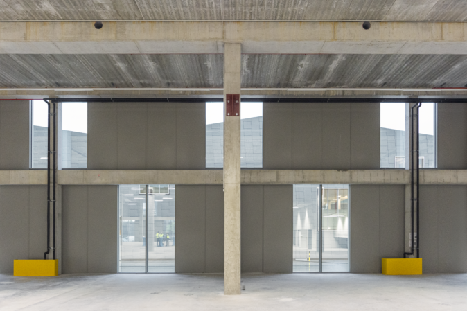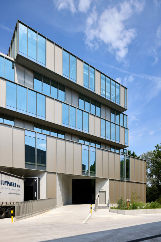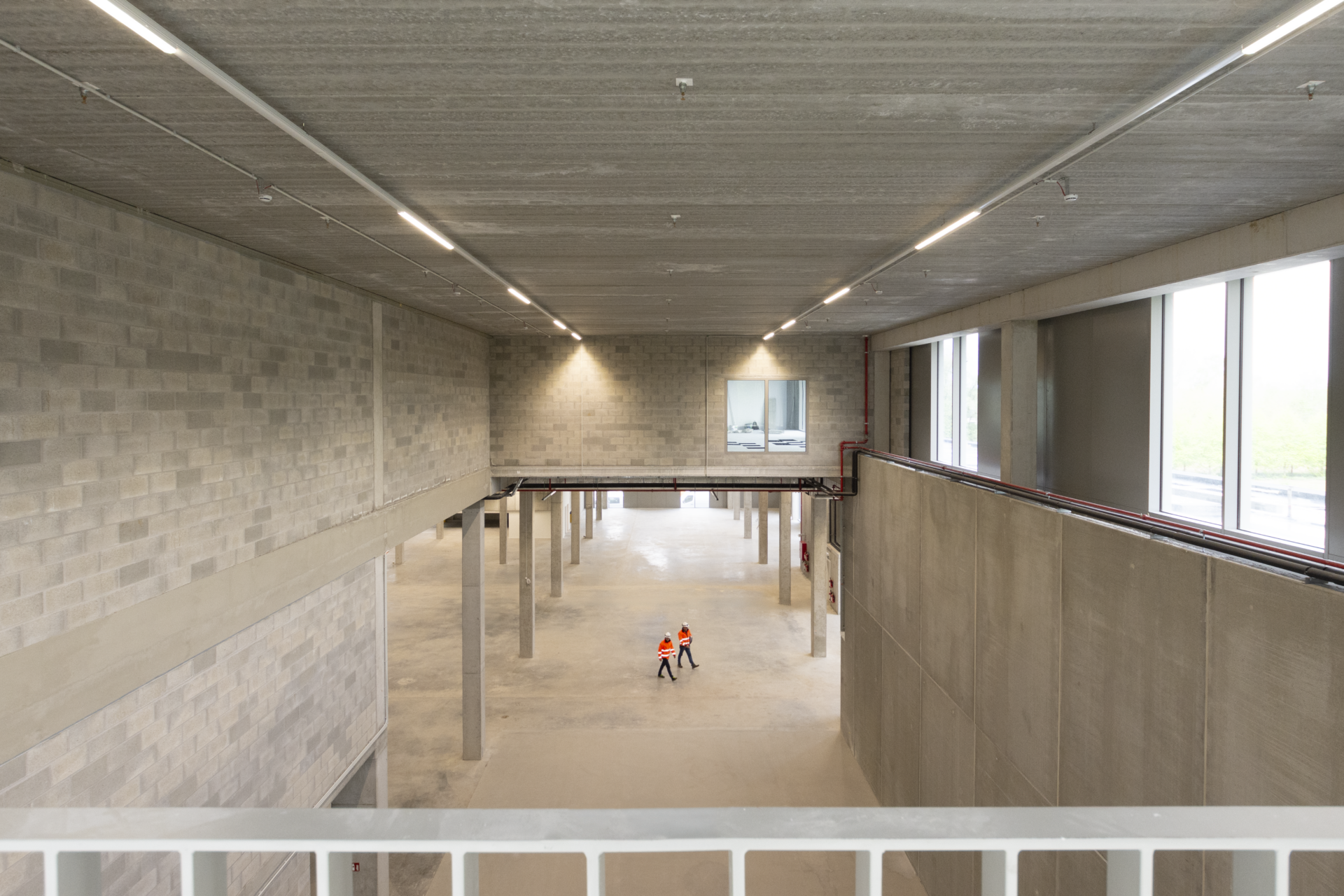 Le défi était de combiner ces deux fonctions en un ensemble uniforme, le langage formel du volume supérieur se prolongeant largement dans le volume inférieur. Le but de cette conception est de créer un bâtiment où les les activités et les bureaux travaillent en harmonie et sont séparés d’une manière sûre et contrôlée, conformément à toutes les réglementations existantes. La conception est basée sur une grille entraînée de 1,35 m x 1,35 m ou 8,10 m x 8,10 m.