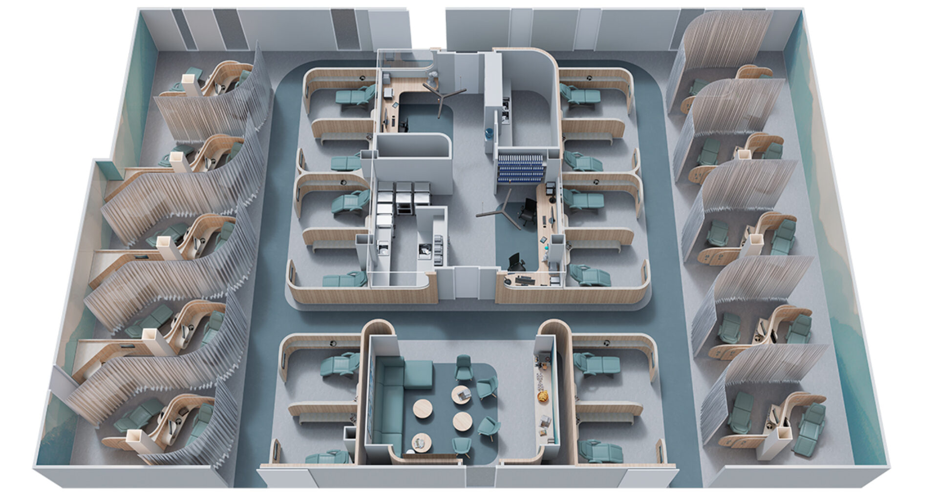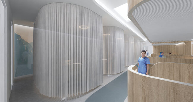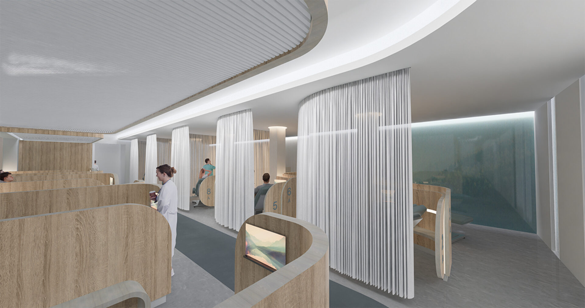 Le secteur de prise en charge de l’hôpital de jour se développe dans un seul et grand espace comprenant en son centre un volume travaillé en bois accueillant le poste infirmier et des box ouvert et semi-ouverts. L’espace se structure avec des « vagues » en bois accueillant chacune deux à trois fauteuils patients. Cette composition architecturale intérieure est agrémentée de lumière zénithale naturelle et artificielle ; et de visuels sur le thème de la nature favorisant l’apaisement.