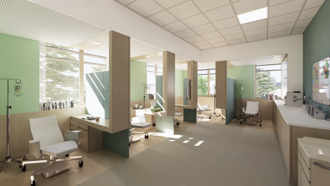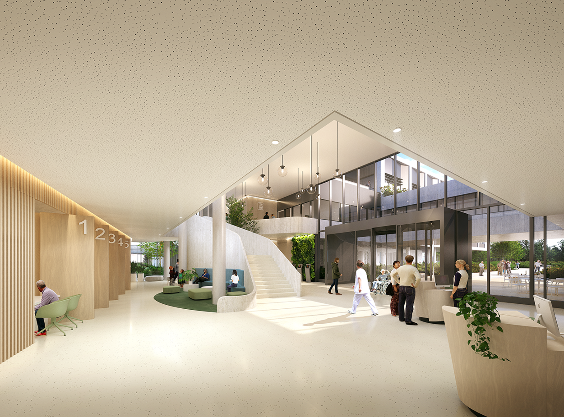 L’articulation du nouveau hall, sur la future façade, l’image du PRC, agit comme une rotule pour accueillir, distribuer les flux vers les différents services. Il se connecte aussi à une entrée distincte vers la médecine nucléaire et le GIE. Les parcours intérieurs ont été pensés avec une marche en avant permettant l’identification d’un sens de circulation, dirigeant vers les flux d’entrée et accueillant les flux de sorties.