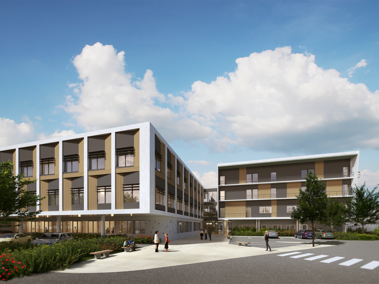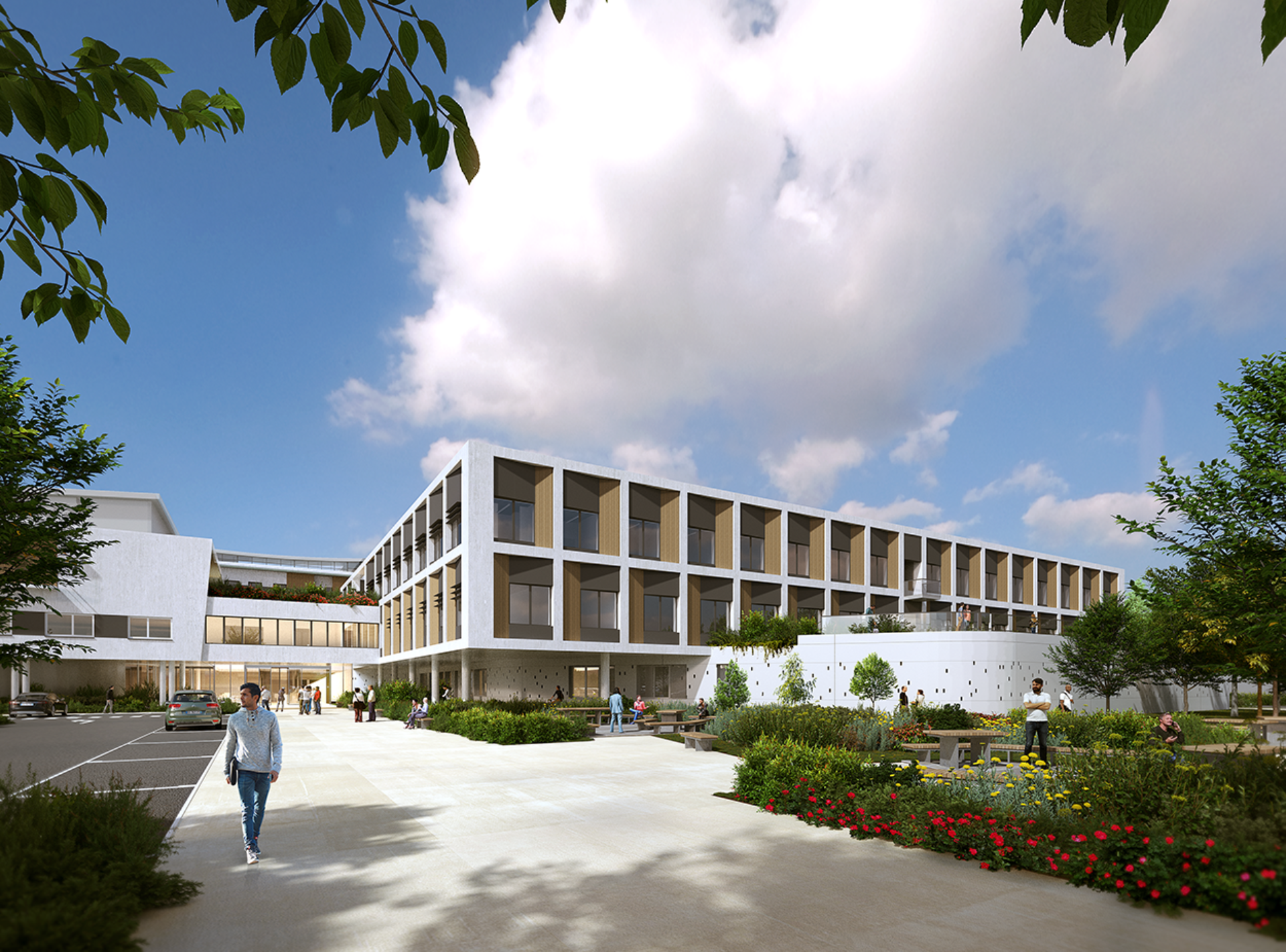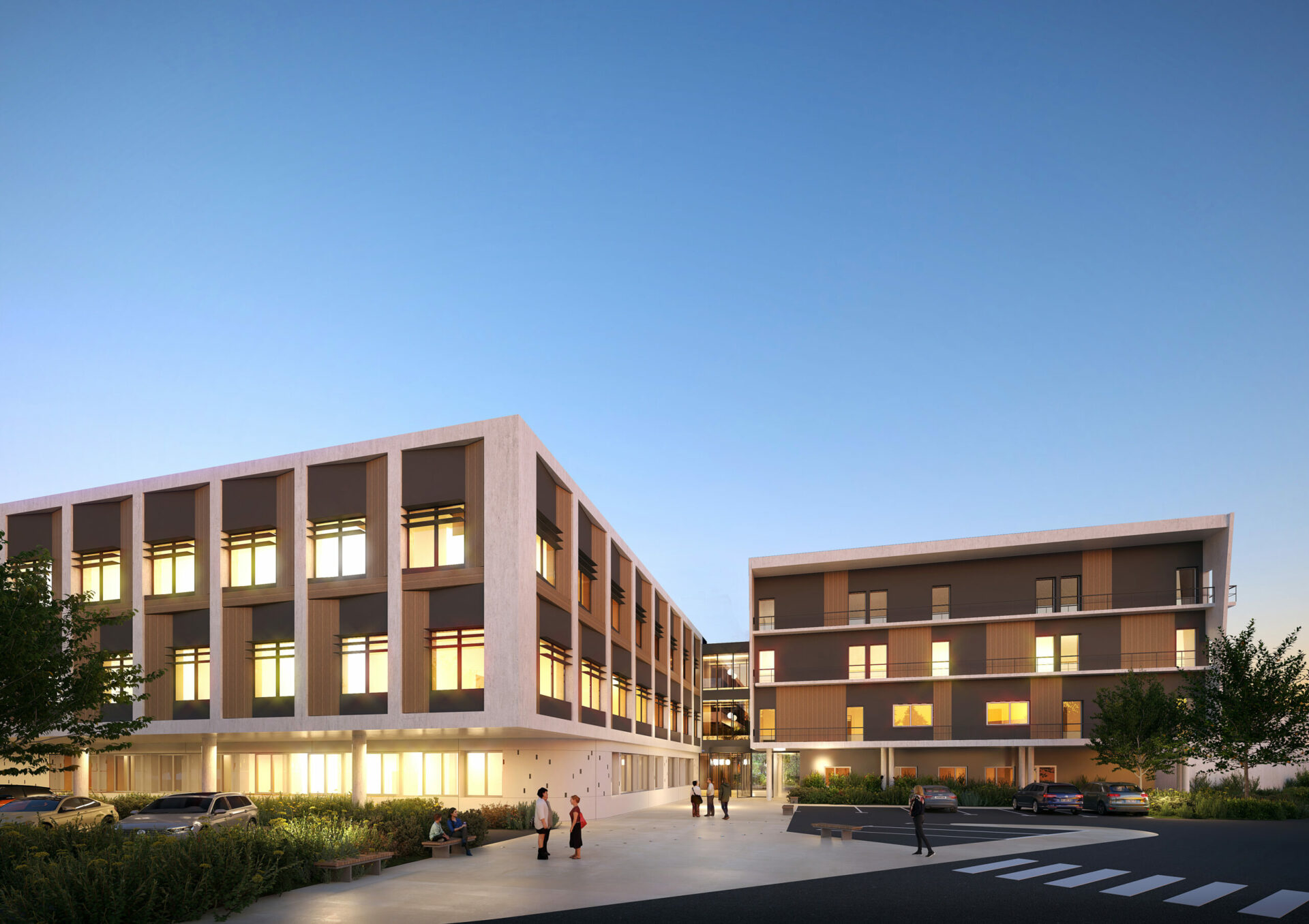 Les enjeux de lisibilité d’orientation et d’identité du PRC sont traités par une architecture unitaire, à l’échelle humaine. Notre stratégie d’implantation du bâtiment permet de réorienter, l’entrée du PRC1 et PRC2 unifiés comme une étape d’un parcours d’arrivée plus global vers les différents bâtiments du site.