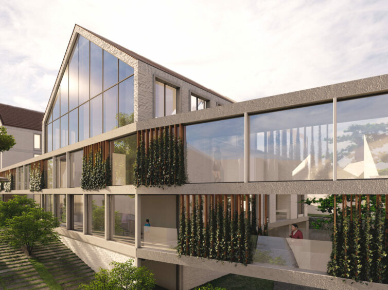 En complément des qualités architecturales et d’aménagements intérieurs proposés, ce projet inclue une conception vertueuse et respectueuse de son environnement. Le bois est un des principaux matériaux bas carbones qui est largement déployé dans cette construction. Il se retrouve dans la structure du bâtiment, dans les façades qui sont composées de panneaux préfabriqués en ossature bois avec ses menuiseries bois, dans les habillages acoustiques intérieurs et le mobilier. De plus, le choix d’une construction hors site et l’intégration de la notion d’économie circulaire complètent la démarche d’écoconstruction qui accompagne ce projet.