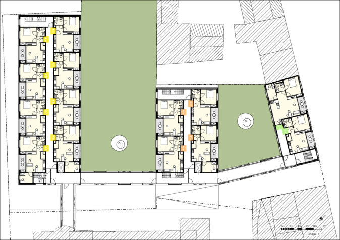 L’architecture s’inscrit ainsi en harmonie avec son environnement en proposant une palette de matériaux et des couleurs reprenant les tons clairs existants, qui apportent de la lumière et un sentiment de douceur et confère une ambiance conviviale, rassurante et réconfortante.