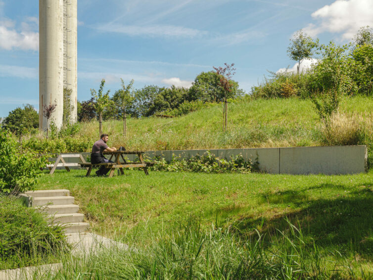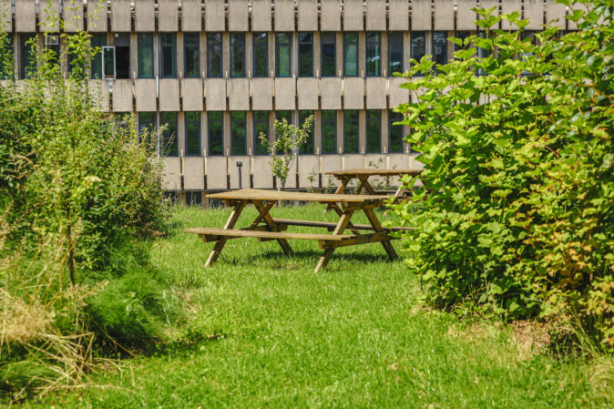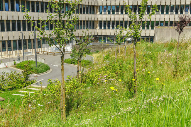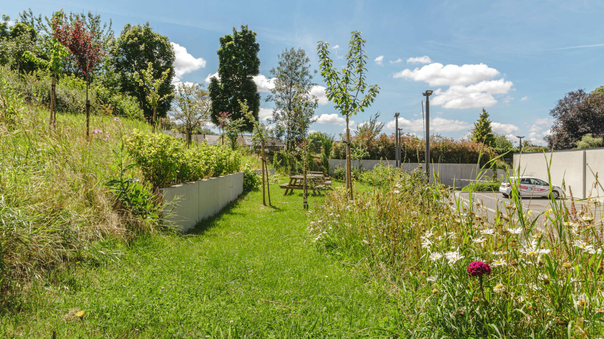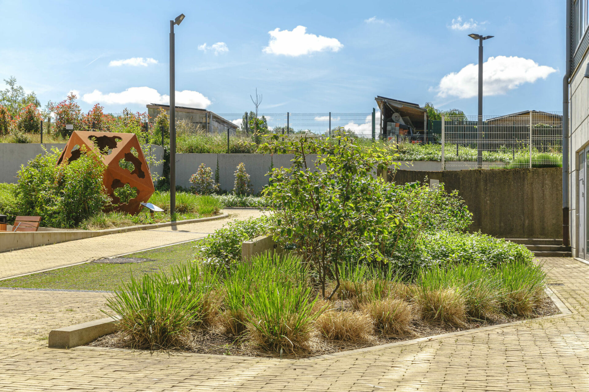 Les abords directs des extensions sont végétalisés. Ceux-ci sont également recouverts de végétation grimpante. Des espaces de repos sont aussi dégagés à proximité de l’entrée. Nous avons été attentifs à un choix de plantes indigènes et non invasives. La végétation se présente de fragments de nature, donnant un sentiment de bien-être visuel aux patients, visiteurs et aux personnels. En plus des effets bénéfiques sur l’humain, l’aménagement paysager favorise la biodiversité locale en attirant la faune grâce à des zones fleuries et à des espaces dédiés. Cela renforce le lien entre l’hôpital et son écosystème naturel, créant un équilibre environnemental tout en réduisant l’impact écologique du projet.