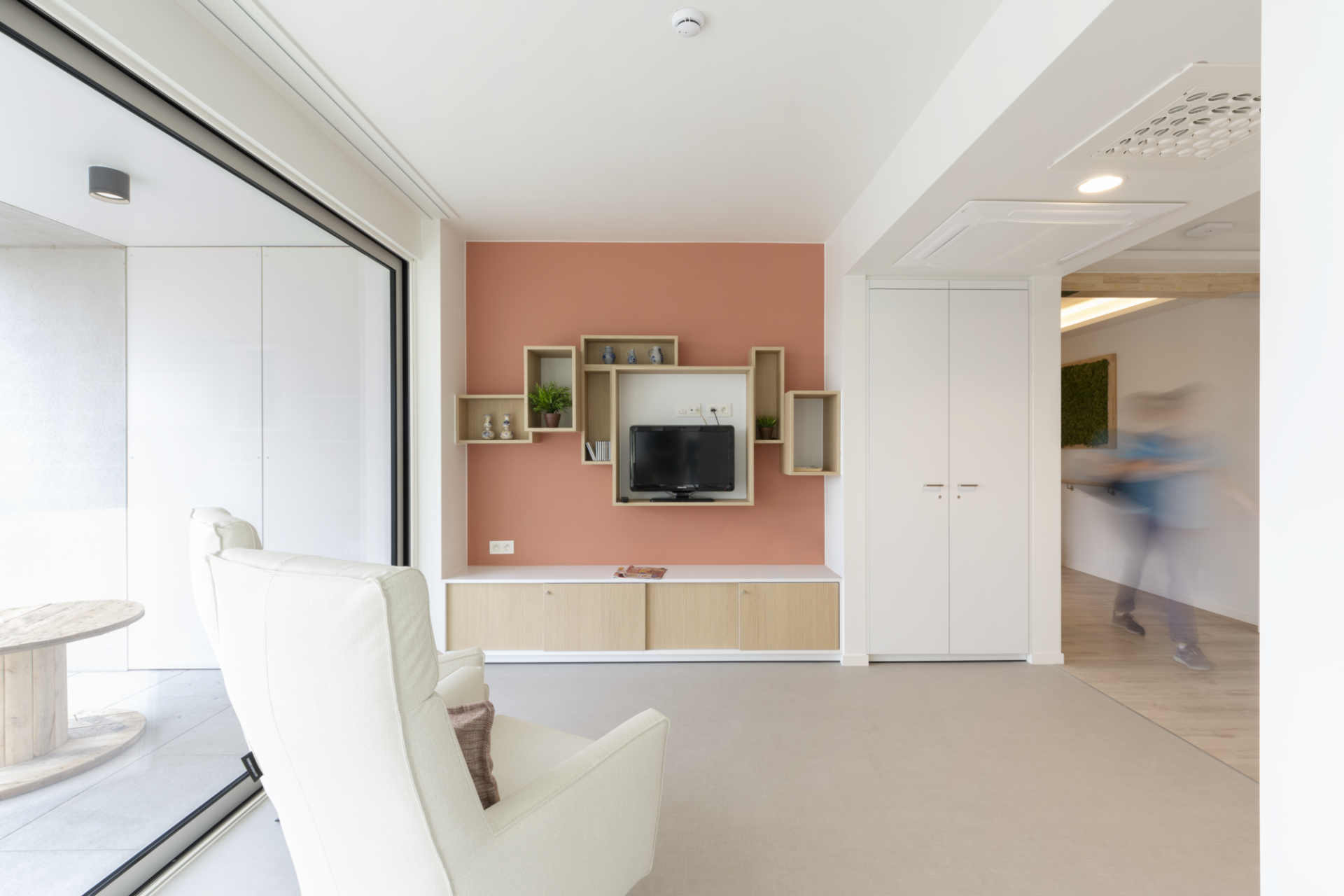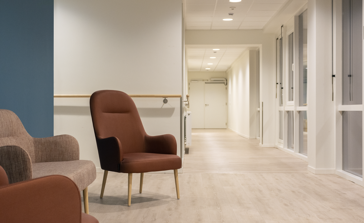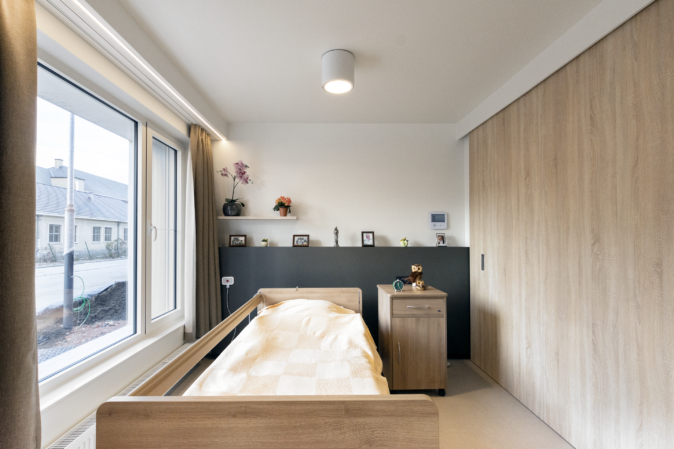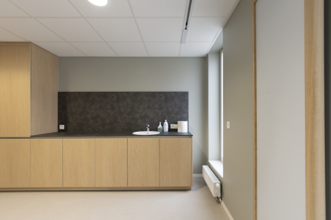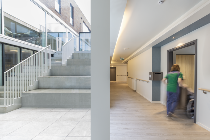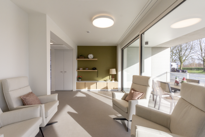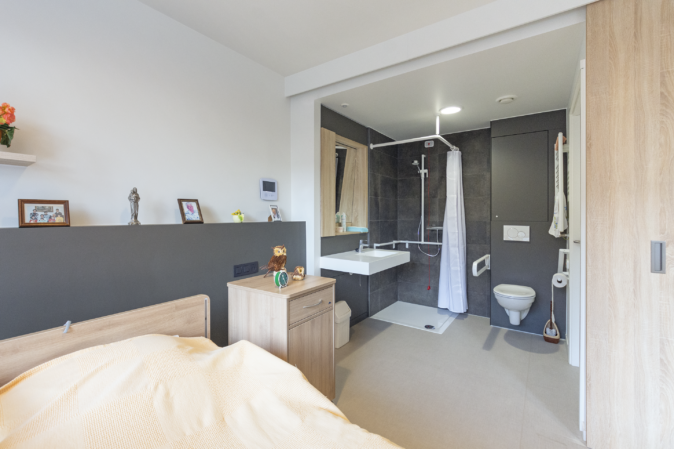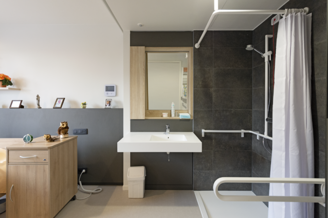 Pour les résidents spécifiques, il est important de concevoir un bâtiment accueillant, reconnaissable et accessible aux fauteuils roulants. Cela se reflète à la fois dans le design et la finition. Une grande attention a été accordée à la lumière et aux vues ainsi qu’à des matériaux de finition “doux”, qui dégagent de la chaleur, tels que la structure en bois pour le sol et le papier peint décoratif. La même ambiance se répète dans la salle de bains, par l’utilisation de carrelages muraux et de sol de grand format. Y est placée, une armoire à miroir fixe intégrée qui répond aux exigences d’accessibilité en fauteuil roulant.
