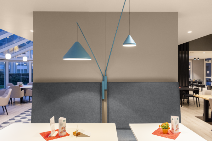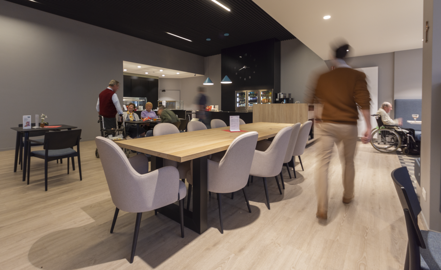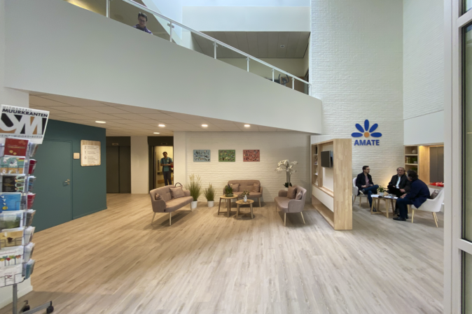 C’était très important pour le grand café, car c’est le cœur du campus de soins Sint-Jozef. C’est un endroit très fréquenté, où se retrouvent non seulement les résidents, mais aussi les habitants du quartier, pour manger, boire, assister à un spectacle, jouer à des jeux de société et bien d’autres choses encore. Cet espace a été ouvert autant que possible pour bénéficier au maximum de la lumière du jour. La terrasse a été élargie vers l’entrée principale afin de profiter pleinement de l’extérieur en été. De petits coins salons confortables ont été aménagés ; chacun peut y trouver sa place préférée en combinant différentes façons de s’asseoir. Des représentations peuvent être organisées grâce à l’espace disponible pour installer une scène et une sonorisation adaptée. Pour les matériaux, on a utilisé la structure en bois clair Amate et des accents noirs. Un plafond en feutre assure une bonne acoustique. Les accents bleu pétrole égayent la salle et rappellent subtilement la couleur bleue du logo Amate.