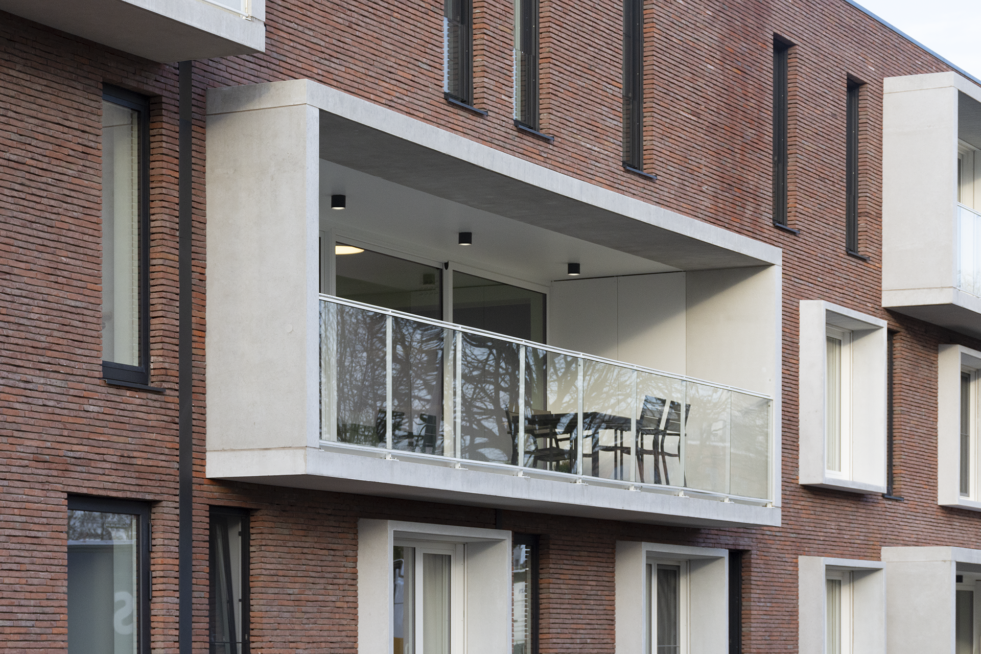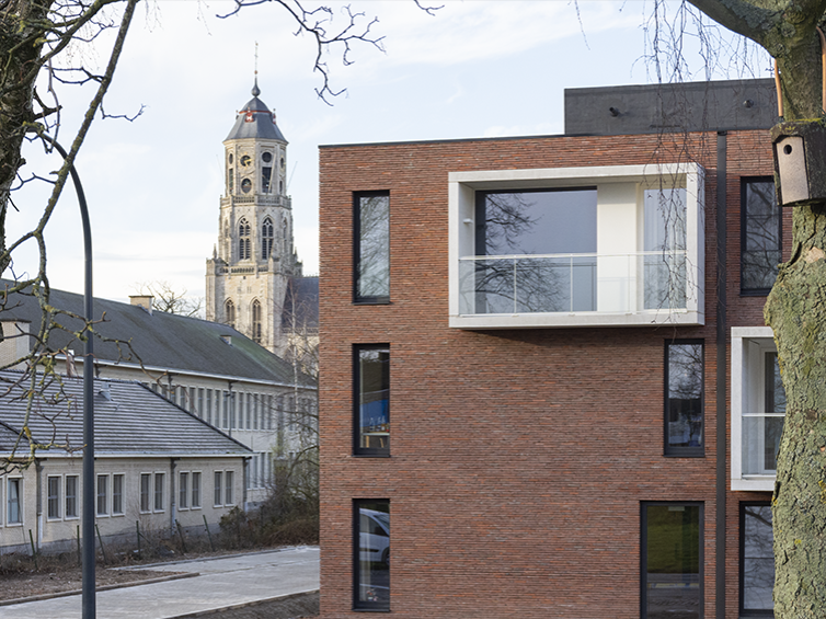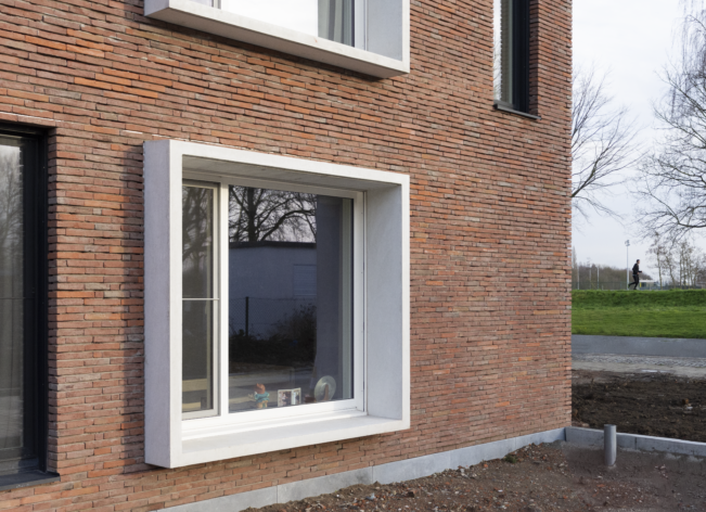 Une brique rouge a été choisie pour la finition de la façade. Elle s’inscrit parfaitement dans cet environnement urbain. Cette brique de parement se marie avec des éléments saillants en béton qui encadrent les fenêtres et créent des terrasses. L’utilisation de béton apparent se retrouve également dans le patio. Les toits plats et libres sont conçus comme des toits végétalisés.