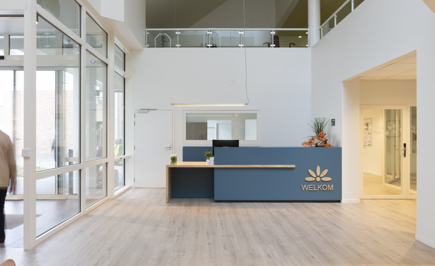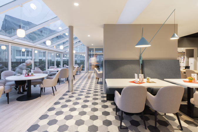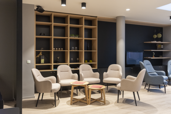 L’entrée prend clairement la forme d’un auvent ouvert sur l’extérieur. On entre dans la maison de retraite et de soins par un sas vitré avec accès direct à la réception, d’une part, et au grand café, d’autre part. Le comptoir de la réception est très ouvert. Derrière lui, se trouve le back-office, plus fermé, ainsi que les autres locaux administratifs. Un couloir central interne a été prévu pour le personnel, de même qu’un couloir public à l’arrière pour accéder à l’une des ailes du campus.