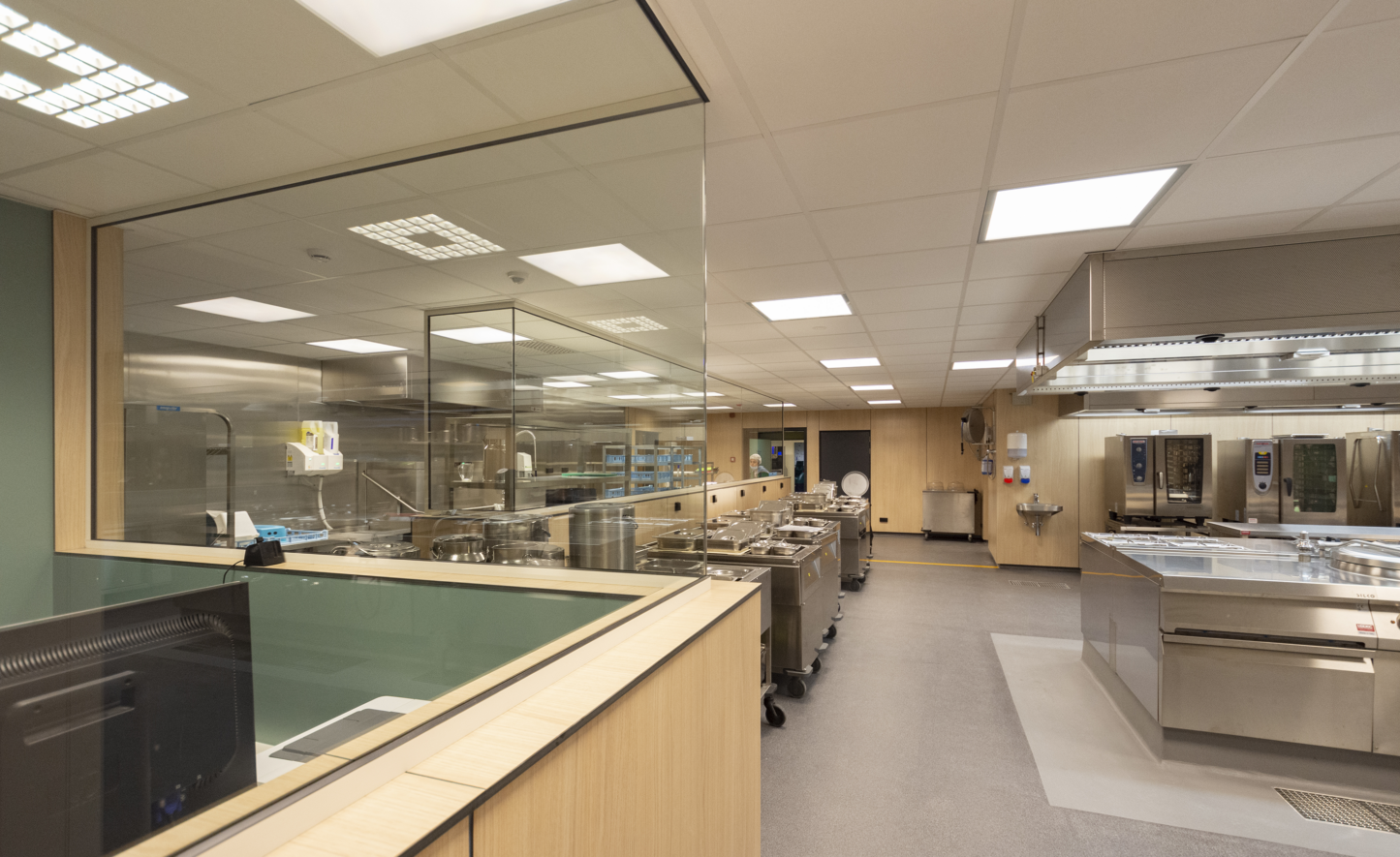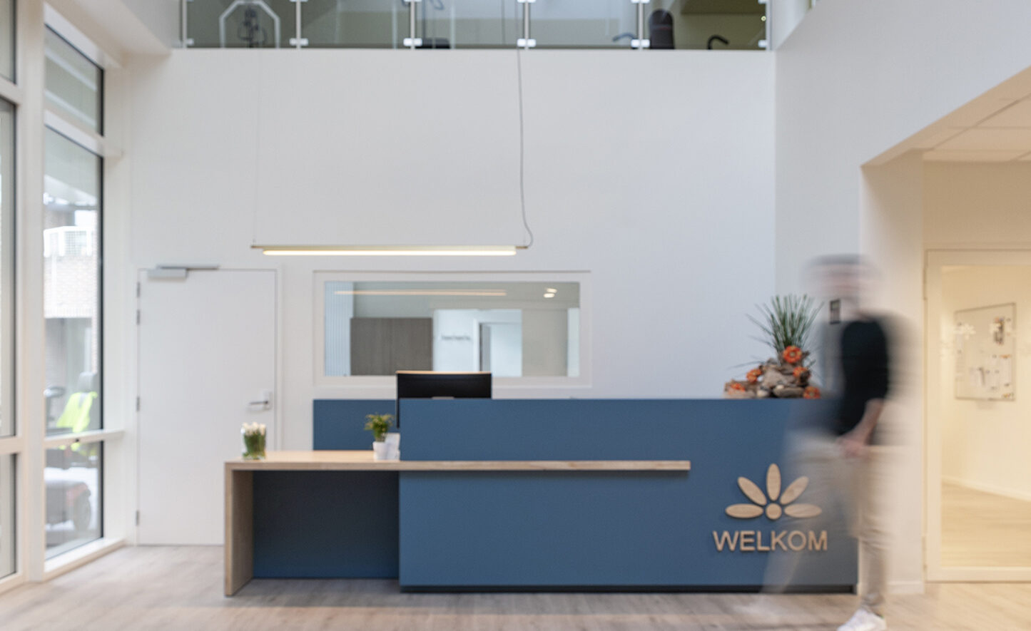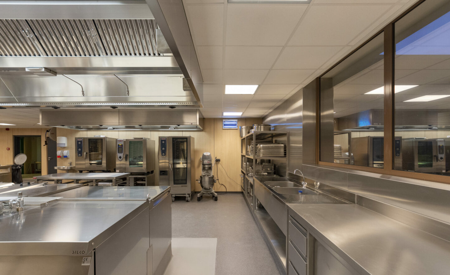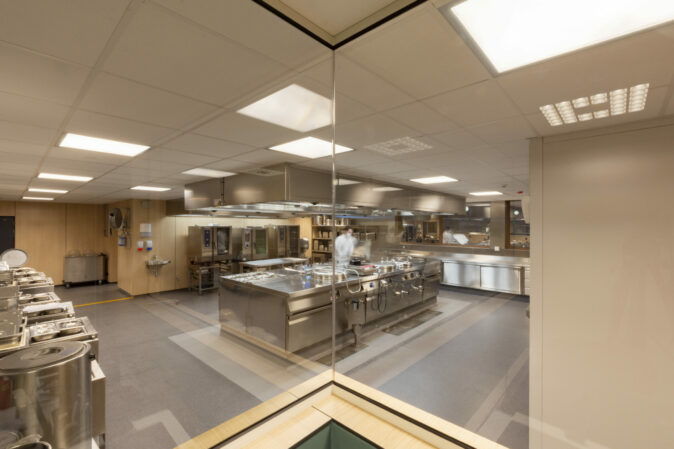En plus de ce nouveau bâtiment, une partie des bâtiments existants a également été rénovée, à savoir le grand café ainsi que la réception et ses locaux administratifs. Le principe consistait à optimiser l’utilisation de l’espace et d’adapter le « look and feel » aux préférences modernes ainsi qu’aux autres campus de l’ASBL Amate afin d’assurer une cohérence. Le style maison Amate parcourt donc tout le bâtiment. Le choix s’est ainsi porté sur une structure en bois clair qui traverse le bâtiment. Dans les espaces réservés aux résidents et/ou au personnel, ce bois clair est associé à des couleurs d’accent gaies qui alternent pour faciliter l’orientation dans l’ensemble du bâtiment. La zone d’entrée adhère également à cette philosophie.