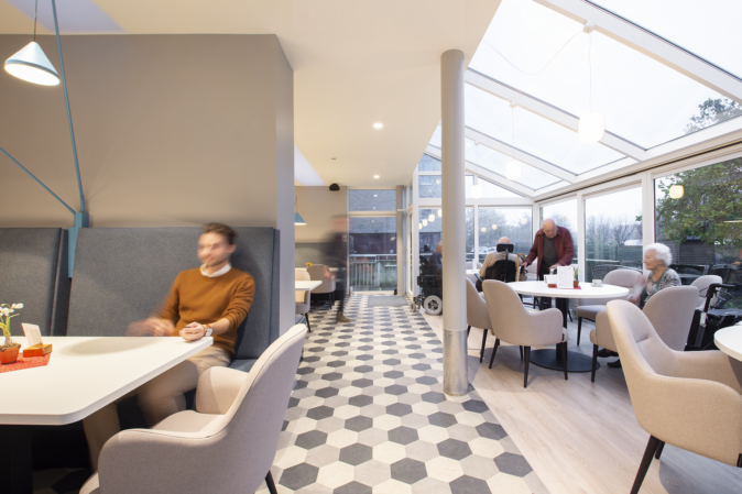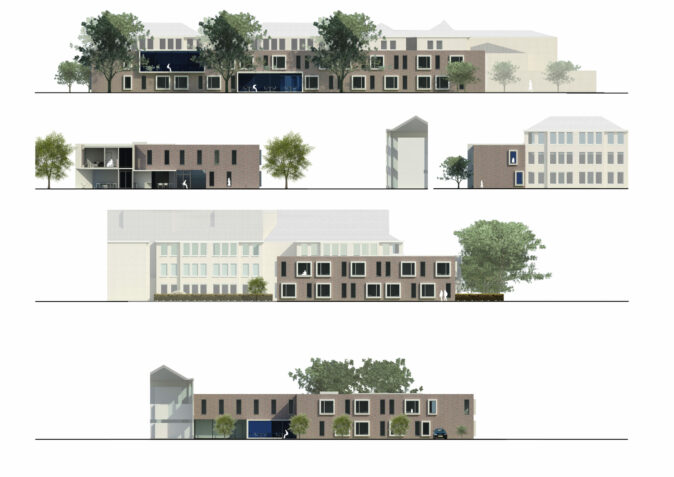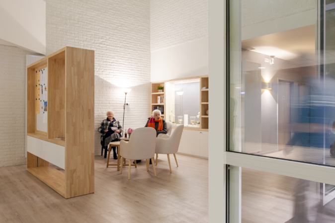 Le bâtiment a été conçu pour une vie normalisée à petite échelle. La section se compose de 2 groupes de vie. Chaque groupe d’habitation de 16 résidents est situé sur un seul niveau. Un groupe de vie se compose de deux « maisons » de 8 résidents chacune. Entre deux maisons, un grand espace commun peut être librement divisé. Il permet de créer plusieurs coins salons, cloisonnés ou non, une cuisine et un coin repas. Une attention particulière a également été portée à la connexion entre les deux niveaux. À la fois physiquement, avec des escaliers et des ascenseurs, et visuellement, avec un espace ouvert/patio.