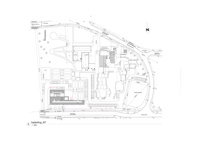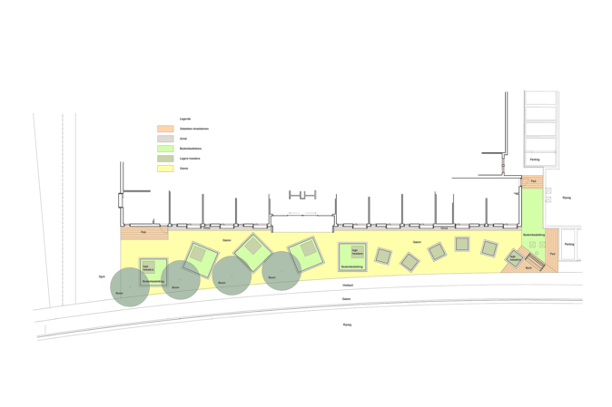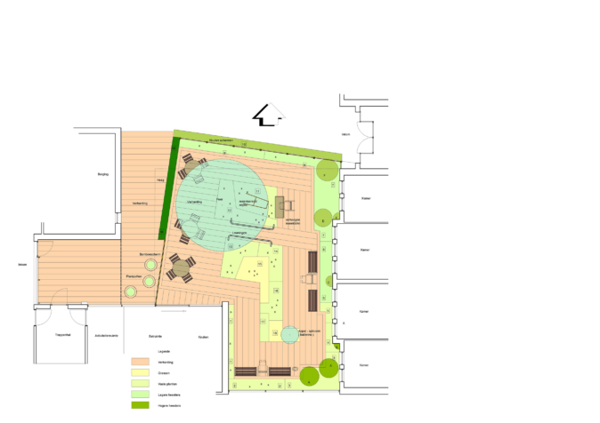 Les éléments repris du bâtiment consistent en la largeur des porte-à-faux des fenêtres. Des cadres carrés plantés sont ainsi réalisés dans le sol, également bordés de béton blanc, comme c’est aussi le cas dans le bâtiment. Le dynamisme naît, d’une part, des changements constants de direction des cadres et, d’autre part, de la prolongation de ce mouvement dans la partie la plus étroite du jardin. Cependant, la figure revêt aussi une signification plus profonde. La forme fixe des cadres représente l’environnement stable dans lequel les soins sont prodigués et le haut niveau de qualité constant. D’autre part, le mouvement symbolise la recherche de formes de soins toujours nouvelles et la dynamique du secteur, le fait de ne pas se reposer sur ses lauriers.