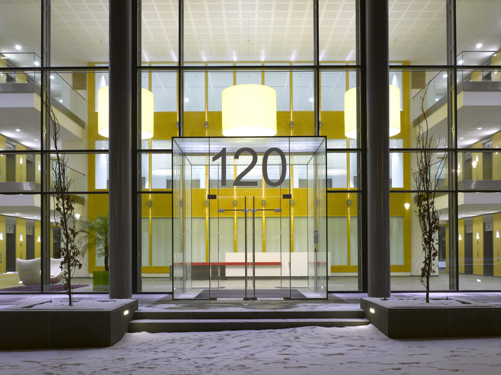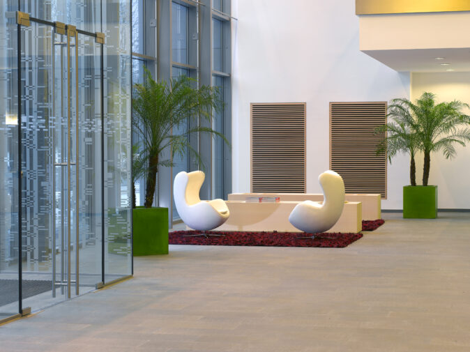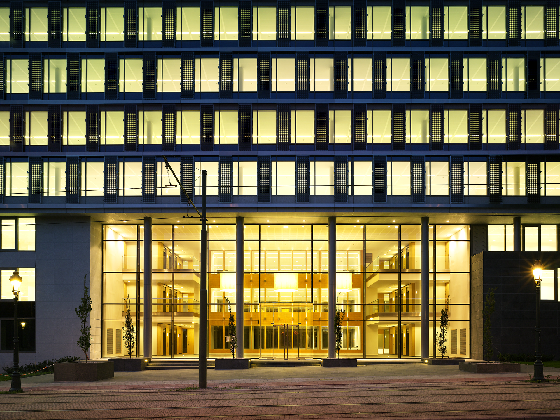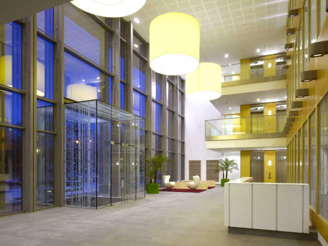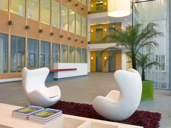 Afin de créer une diversification significative des espaces intérieurs, d’offrir une grande flexibilité d’occupation, et surtout de maximiser l’éclairage naturel, les concepteurs ont percé deux façades de grands atria vitrés sur une hauteur de 3 niveaux : l’un côté chaussée, l’autre côté jardin. Afin de le rendre plus performant, le projet explore toutes les options possibles en matière de développement durable : géothermie, photovoltaïque, isolation renforcée, protection solaire, récupération des eaux pluviales, …