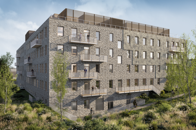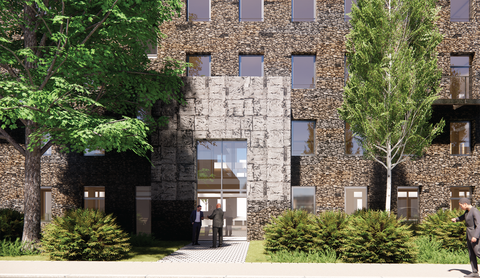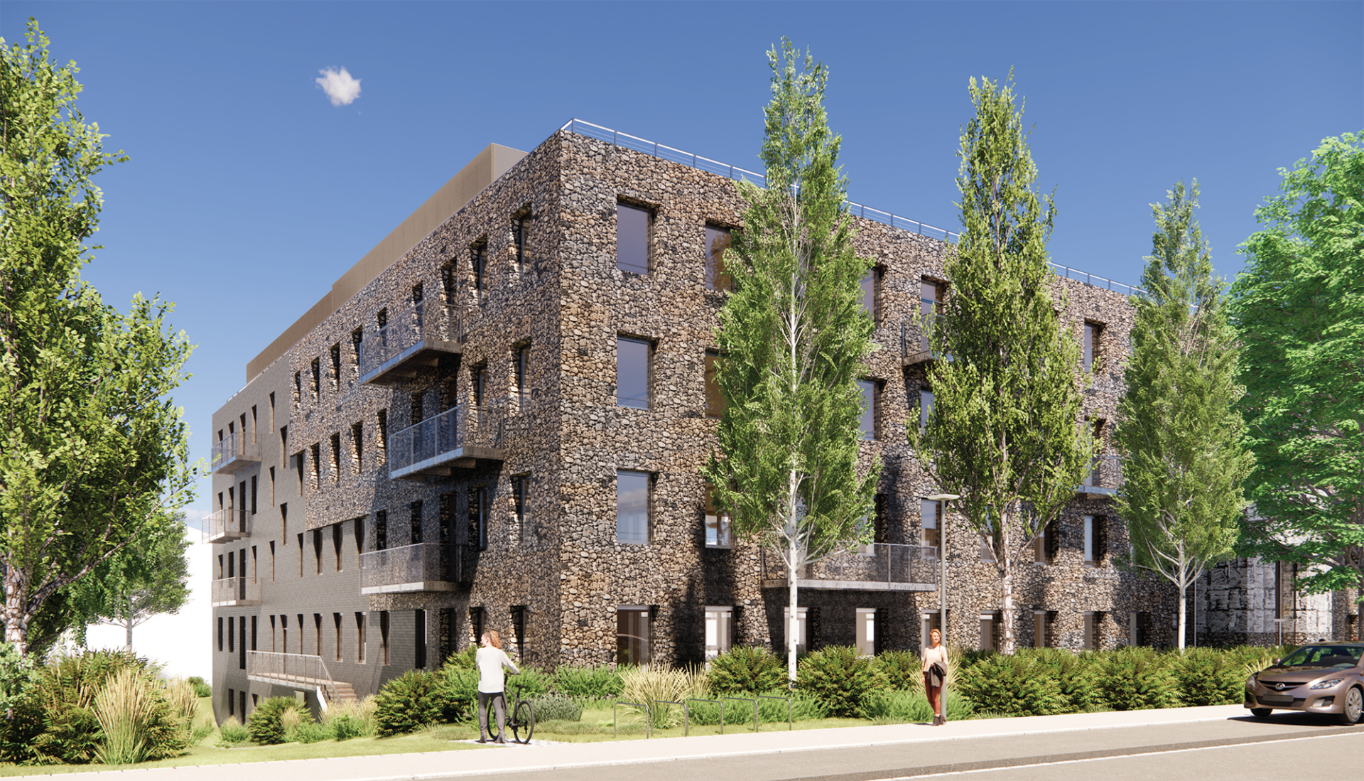 Le concept envisage une construction sobre et se présente sans extravagances. Avec ses façades majoritairement grises, composées de cages à gabion remplies d’agrégats issus de la filière de la déconstruction et du réemploi, the Nest s’affiche comme une muraille naturelle. Les fenêtres se veulent ponctuelles, rythmées, et parfois une porte s’ouvre sur un balcon çà et là. L’enceinte ne se franchit qu’à un seul endroit, l’entrée principale, telle une faille dans cette carapace épaisse. Une fois dans le hall, le ton est donné entre matériaux naturels, pauvres en carbone (le bois) et matériaux de réemploi. C’est grâce à ce dernier que l’image de marque est renforcée, avec des marbres récupérés de lieux prestigieux des environs. C’est l’objectif : sillonner les chantiers de déconstruction du coin et donner une seconde vie à ces éléments choisis avec soin.