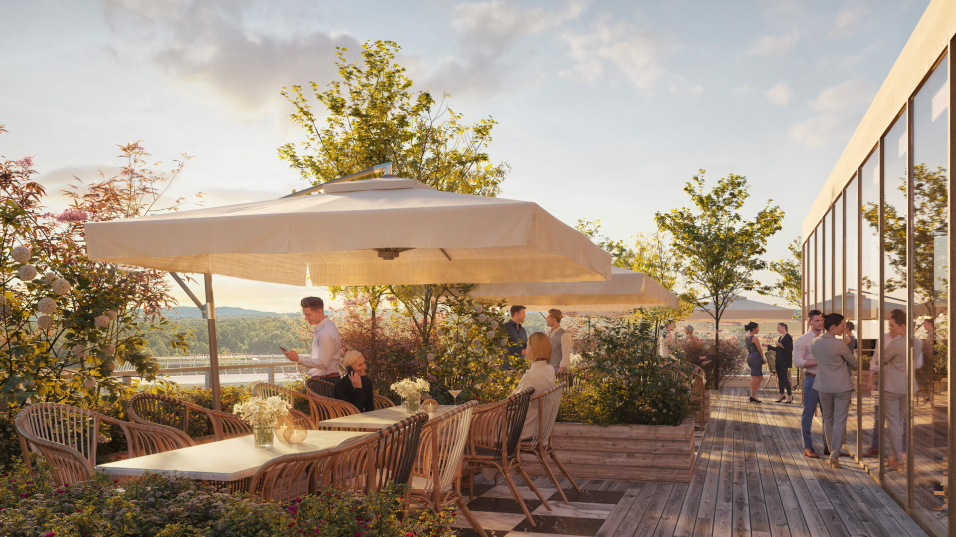 | program | 7.200 m² bureaux, 4 niveaux, jardin luxuriant, services au rez-de-jardin, restaurant & bar rooftop, mobilité douce |