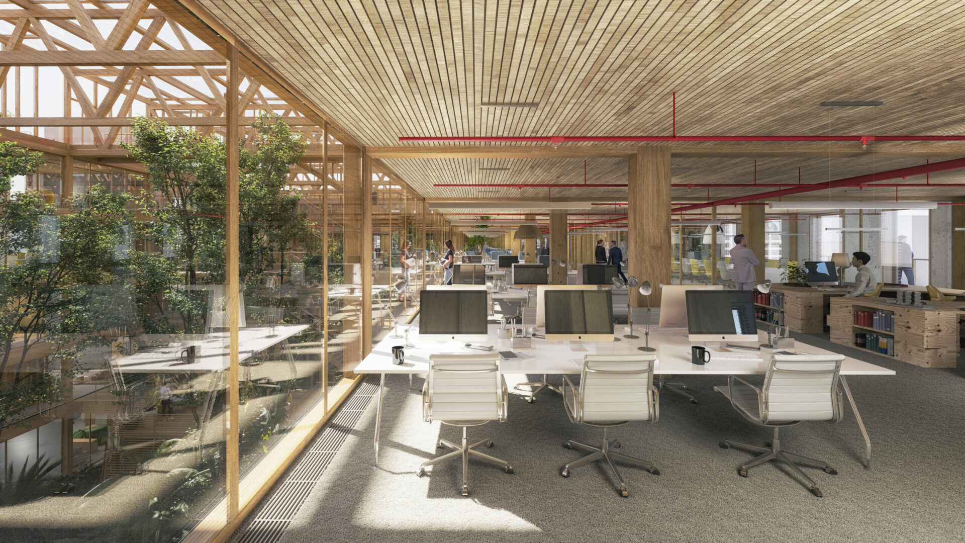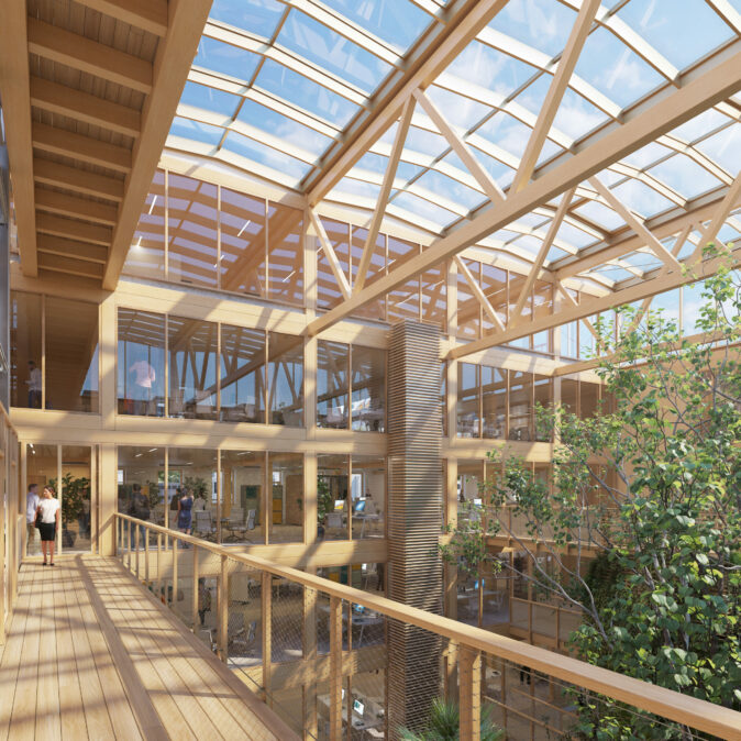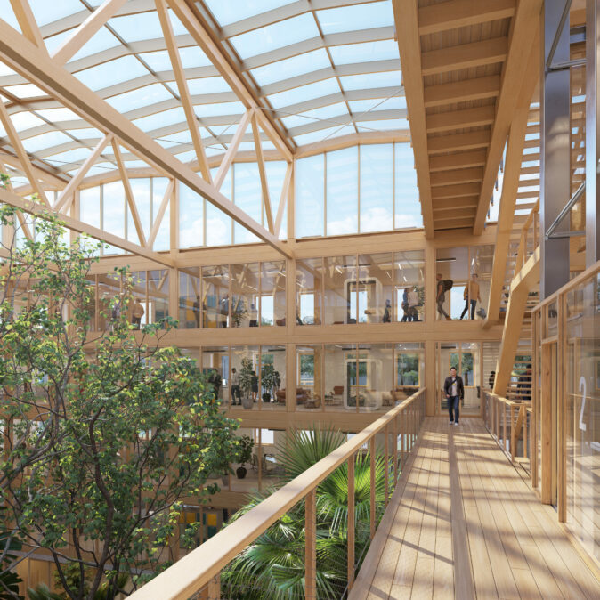 Les cinq niveaux de plateaux de bureaux et les multiples fonctions de services et de loisirs se déclinent autour d’un atrium lumineux, protégé et tout de bois construit. L’atmosphère s’y trouve apaisante. Les accès principaux sont proposés au travers d’une juxtaposition de passerelles en platelages de bois et permettent autant de vues variées sur une canopée luxuriante. Chaque traversée invite à l’évasion et à la découverte, une façon efficace de se ressourcer.