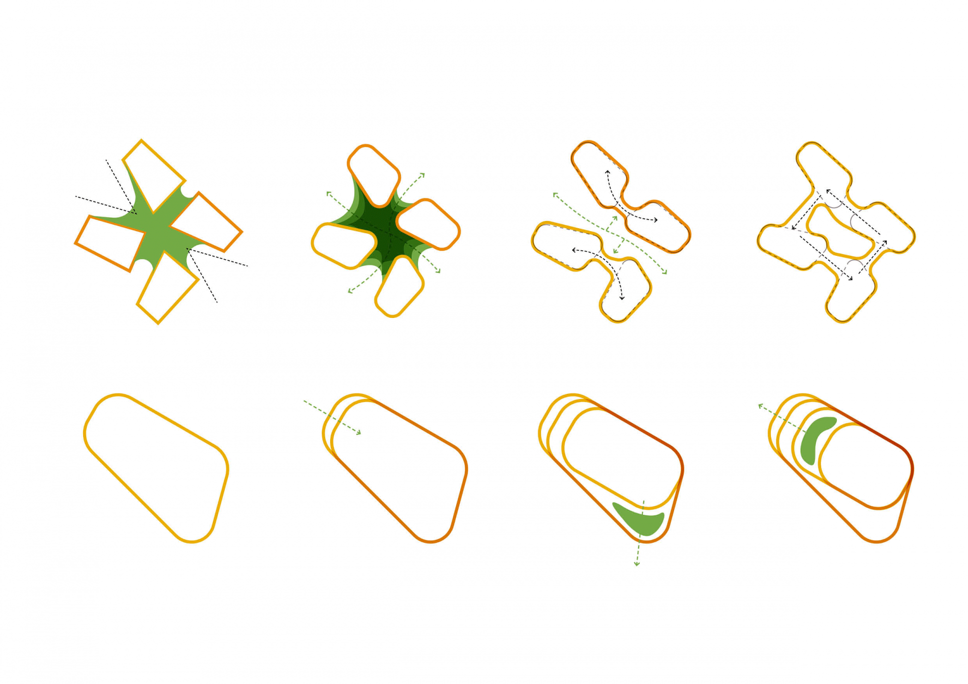 Après une série de préconceptions approfondies à la recherche de la forme parfaite, la conception en quadrants s’est avérée avoir le plus de potentiel, grâce à la possibilité de diviser ou de fusionner l’ensemble. C’était également la forme la plus organique pour intégrer le bâtiment dans son environnement.
