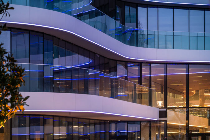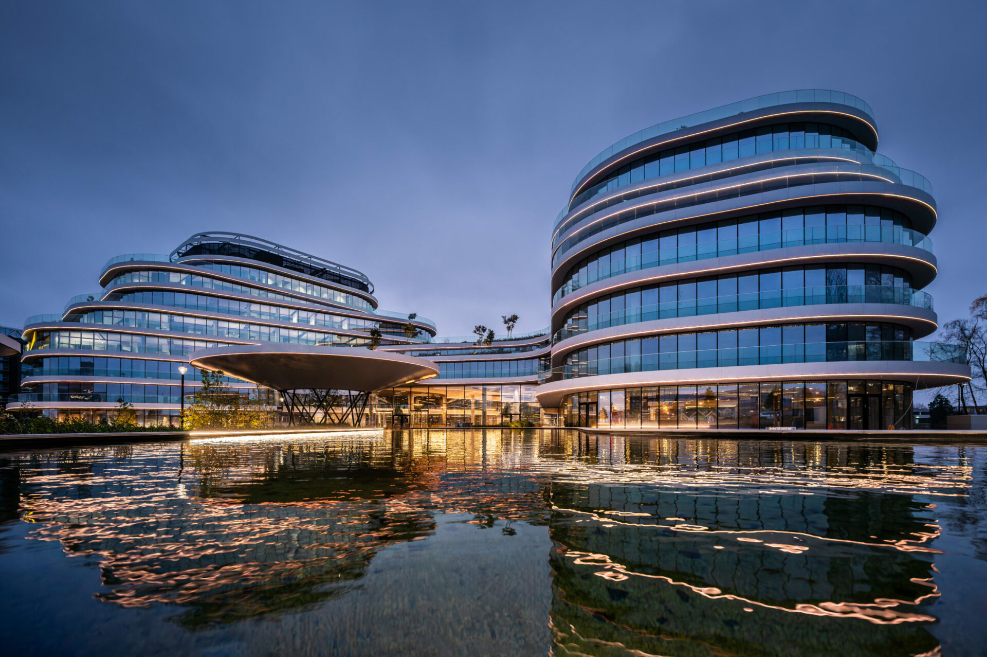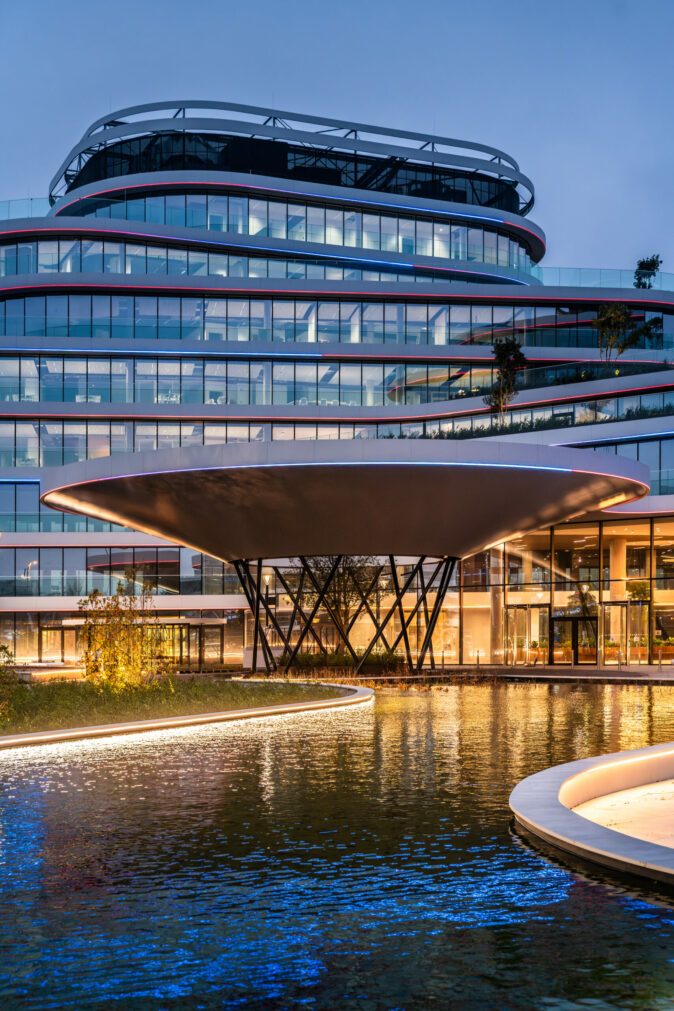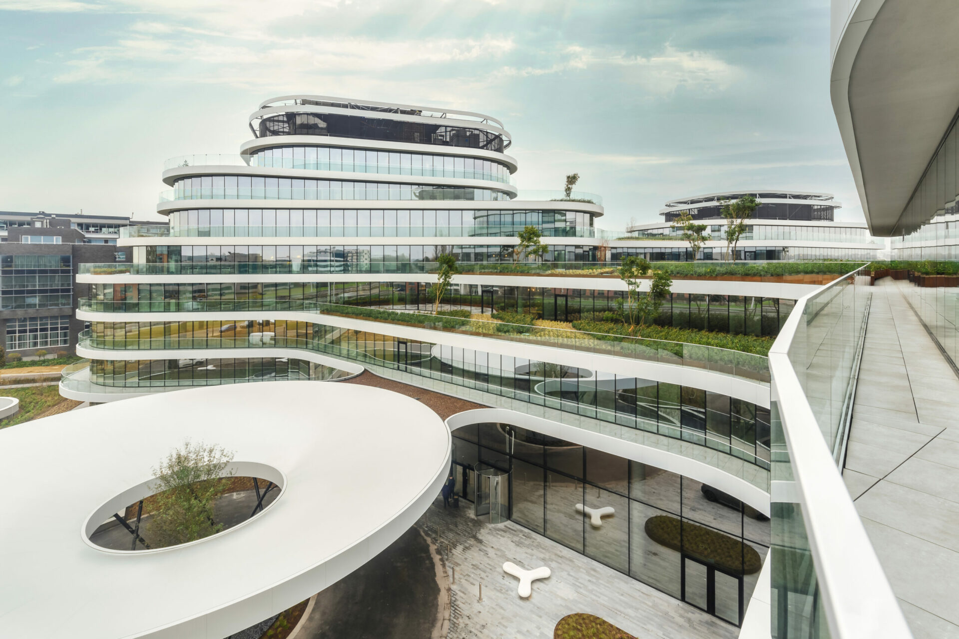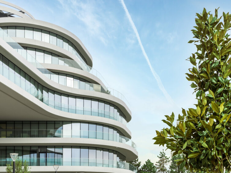 L’architecture organique se distingue par son abondance de verre, ses coins arrondis et ses éléments de façade horizontaux en aluminium gris clair, favorisant la luminosité et une intégration subtile dans l’environnement verdoyant.