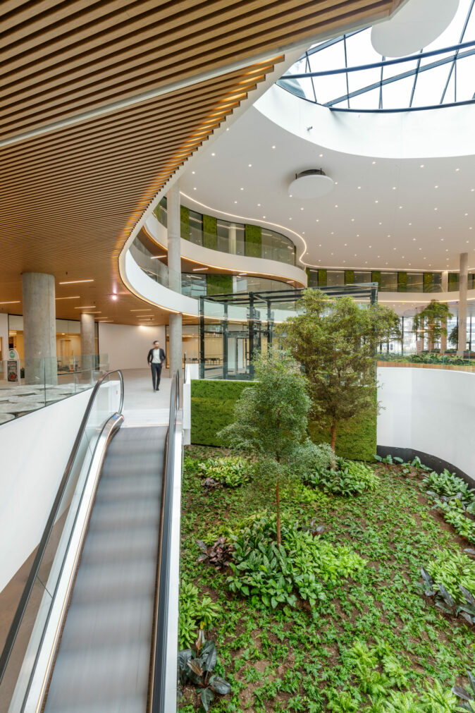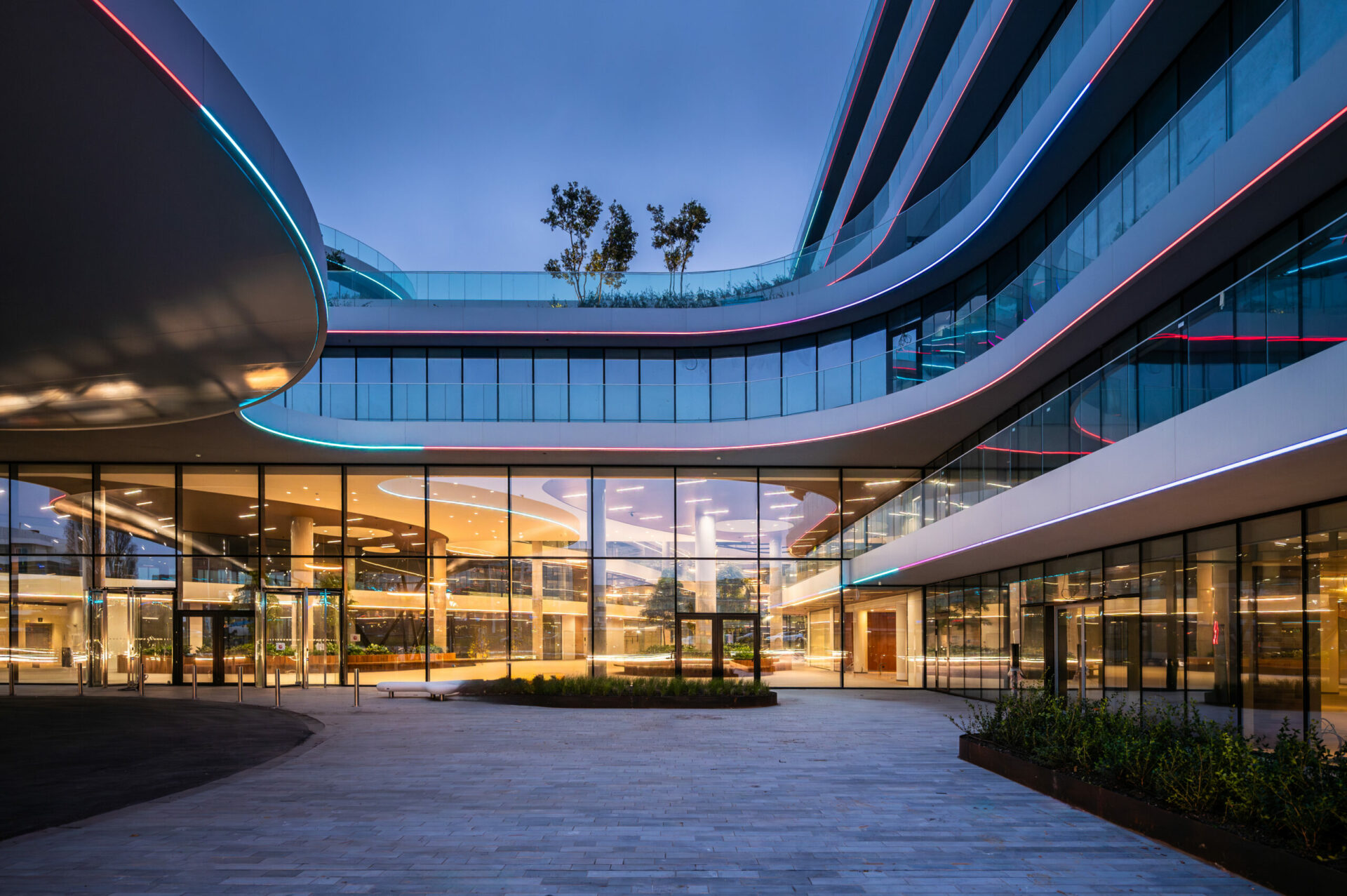 Le relief verdoyant d’origine constitue l’axe transversal et joue un rôle clé dans l’intégration de la végétation dans le projet. Le relief naturel et vallonné se retrouve à la fois dans le grand atrium et dans les hauteurs variables des quatre quadrants. Par conséquent, un complexe accessible a émergé, offrant une réponse délicate au relief naturel du terrain et à l’échelle des constructions environnantes. Grâce à l’orientation spécifique et à la construction en gradins avec des jardins de toit et des terrasses continues, les employés et les clients de l’hôtel bénéficient d’une abondance de vues, d’expériences et d’espaces intérieurs et extérieurs attrayants.