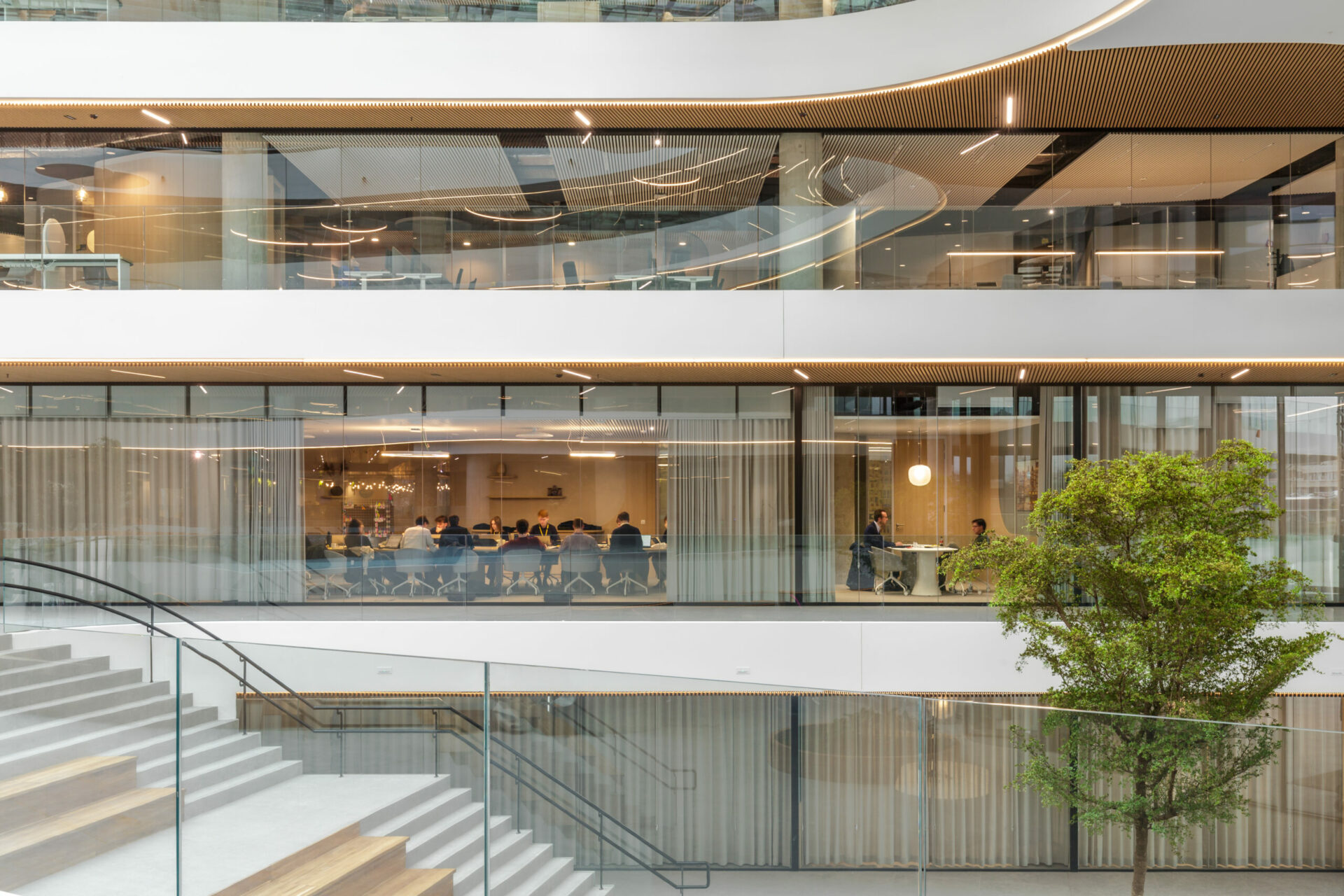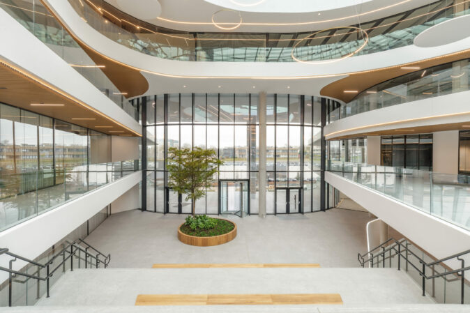 Un effort considérable de consultation a été nécessaire-tant dans la phase de conception que dans la phase de réalisationpour réaliser ces ambitions colossales. Il a été choisi d’opter pour la précontrainte afin de rendre les dalles plus minces et de réduire l’utilisation du béton de 30%. De plus, le revêtement de la façade en aluminium a été choisi car il est recyclable. En ce qui concerne la récupération des eaux de pluie et l’efficacité énergétique, des efforts considérables ont été déployés, notamment par la création de deux vastes systèmes de drainage, l’installation de plus de 600 panneaux solaires et la mise en place d’un vaste champ de géothermie. Dans le cadre de la certification BREEAM, les émissions de CO2 sont surveillées de près et tous les matériaux utilisés sont soumis à une analyse LCA indépendante. Enfin, le concept d’économie circulaire a également été intégré, car le bâtiment est conçu pour être adaptable, avec l’utilisation de matériaux démontables lorsque cela est possible, et il recevra un passeport matériaux dans Madaster.