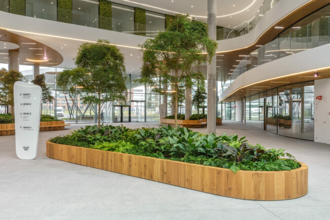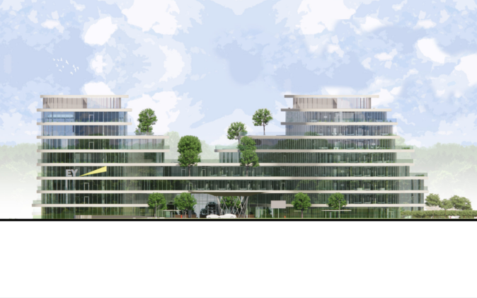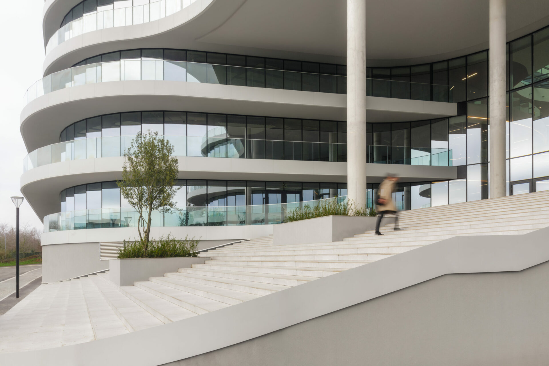 Les quatre quadrants transparents se composent de trois volumes de bureau et d’un hôtel. La forme organique apporte une lumière naturelle de manière très efficace. Chaque « aile » est conçue comme un trapèze qui a été adouci et arrondi dans une phase ultérieure de la conception. Chaque niveau recule et possède une grande terrasse verdoyante. Ces terrasses se fondent à travers les « ailes », créant ainsi des espaces communs de qualité qui relient les quadrants les uns aux autres.